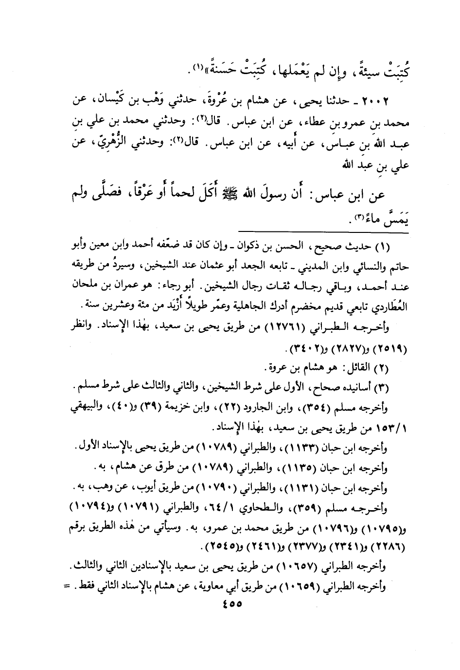 ٢٠٠٢ - حَدَّثَنَا يَحْيَى، عَنْ هِشَامِ بْنِ عُرْوَةَ، حَدَّثَنِي وَهْبُ بْنُ كَيْسَانَ، عَنْ مُحَمَّدِ بْنِ عَمْرِو بْنِ عَطَاءٍ، عَنِ ابْنِ عَبَّاسٍ، قَالَ (٢) : وَحَدَّثَنِي مُحَمَّدُ بْنُ عَلِيِّ بْنِ عَبْدِ اللهِ بْنِ عَبَّاسٍ، عَنْ أَبِيهِ، عَنِ ابْنِ عَبَّاسٍ، قَالَ: وَحَدَّثَنِي الزُّهْرِيُّ، عَنْ عَلِيِّ بْنِ عَبْدِ اللهِ، عَنِ ابْنِ عَبَّاسٍ: " أَنَّ رَسُولَ اللهِ صَلَّى اللهُ عَلَيْهِ وَسَلَّمَ أَكَلَ لَحْمًا - أَوْ عَرْقًا - فَصَلَّى وَلَمْ يَمَسَّ مَاءً " (٣)