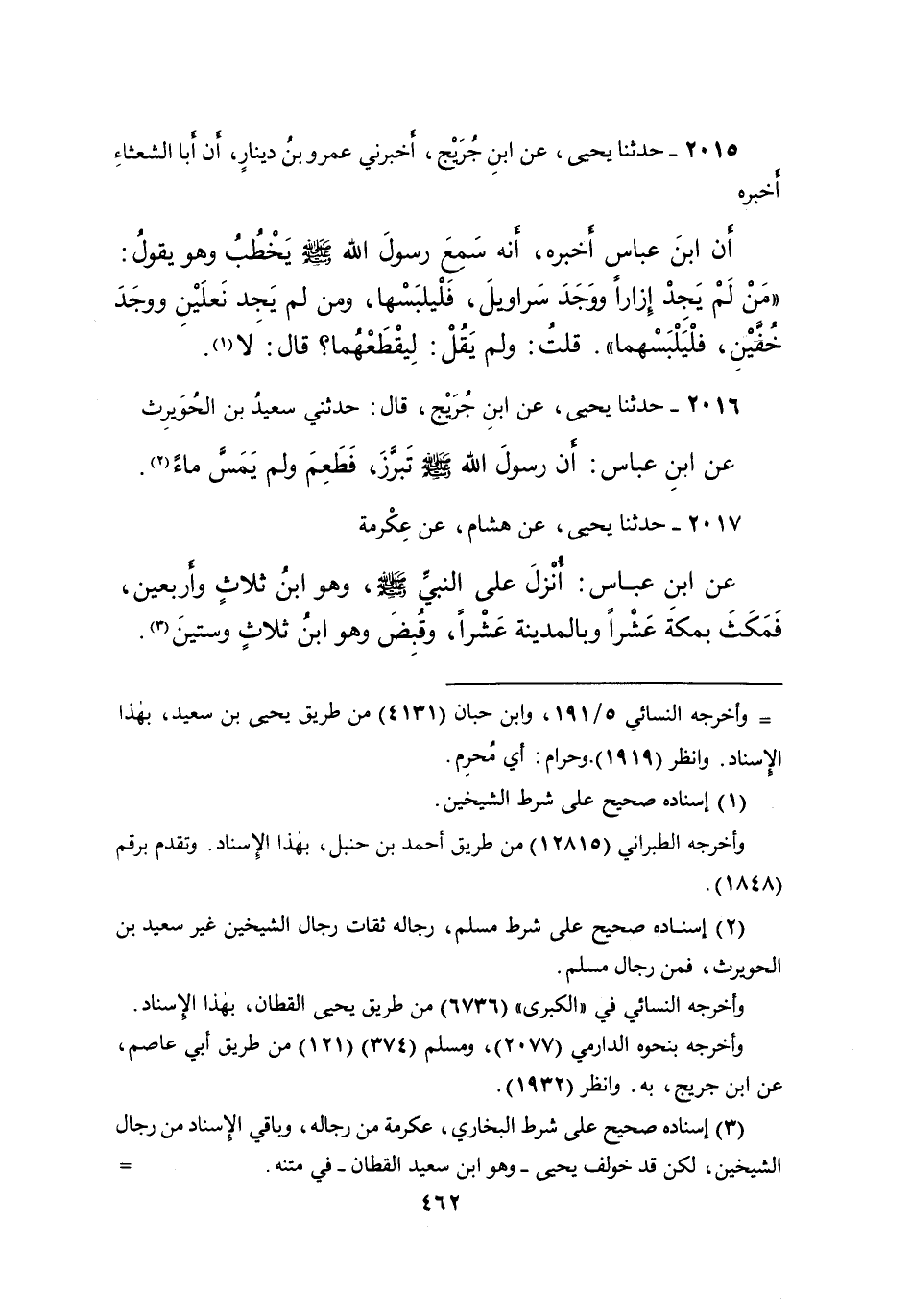 ٢٠١٥ - حَدَّثَنَا يَحْيَى، عَنْ ابْنِ جُرَيْجٍ، أَخْبَرَنِي عَمْرُو بْنُ دِينَارٍ، أَنَّ أَبَا الشَّعْثَاءِ، أَخْبَرَهُ أَنَّ ابْنَ عَبَّاسٍ أَخْبَرَهُ: أَنَّهُ سَمِعَ رَسُولَ اللهِ صَلَّى اللهُ عَلَيْهِ وَسَلَّمَ يَخْطُبُ، وَهُوَ يَقُولُ: " مَنْ لَمْ يَجِدْ إِزَارًا وَوَجَدَ سَرَاوِيلَ فَلْيَلْبَسْهَا، وَمَنْ لَمْ يَجِدْ نَعْلَيْنِ، وَوَجَدَ خُفَّيْنِ فَلْيَلْبَسْهُمَا " قُلْتُ: لَمْ يَقُلْ لِيَقْطَعْهُمَا، قَالَ: لَا (١)