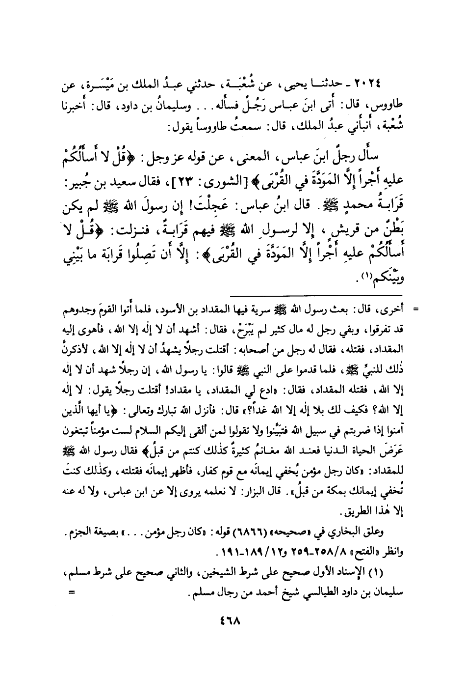 ٢٠٢٤ - حَدَّثَنَا يَحْيَى، عَنْ شُعْبَةَ، حَدَّثَنِي عَبْدُ الْمَلِكِ بْنُ مَيْسَرَةَ، عَنْ طَاوُسٍ، قَالَ: أَتَى ابْنَ عَبَّاسٍ رَجُلٌ فَسَأَلَهُ. . .، وَسُلَيْمَانُ بْنُ دَاوُدَ، قَالَ: أَخْبَرَنَا شُعْبَةُ، أَنْبَأَنِي عَبْدُ الْمَلِكِ، قَالَ: سَمِعْتُ طَاوُسًا، يَقُولُ: سَأَلَ رَجُلٌ ابْنَ عَبَّاسٍ - الْمَعْنَى - عَنْ قَوْلِهِ عَزَّ وَجَلَّ: {قُلْ لَا أَسْأَلُكُمْ عَلَيْهِ أَجْرًا إِلا الْمَوَدَّةَ فِي الْقُرْبَى} [الشورى: ٢٣]- فَقَالَ سَعِيدُ بْنُ جُبَيْرٍ: قَرَابَةُ مُحَمَّدٍ صَلَّى اللهُ عَلَيْهِ وَسَلَّمَ - قَالَ ابْنُ عَبَّاسٍ: " عَجِلْتَ إِنَّ رَسُولَ اللهِ صَلَّى اللهُ عَلَيْهِ وَسَلَّمَ لَمْ يَكُنْ بَطْنٌ مِنْ قُرَيْشٍ، إِلا لِرَسُولِ اللهِ صَلَّى اللهُ عَلَيْهِ وَسَلَّمَ فِيهِمْ قَرَابَةٌ، فَنَزَلَتْ: {قُلْ لَا أَسْأَلُكُمْ عَلَيْهِ أَجْرًا إِلا الْمَوَدَّةَ فِي الْقُرْبَى} [الشورى: ٢٣] : إِلا أَنْ تَصِلُوا قَرَابَةَ مَا بَيْنِي وَبَيْنَكُمْ " (١)
