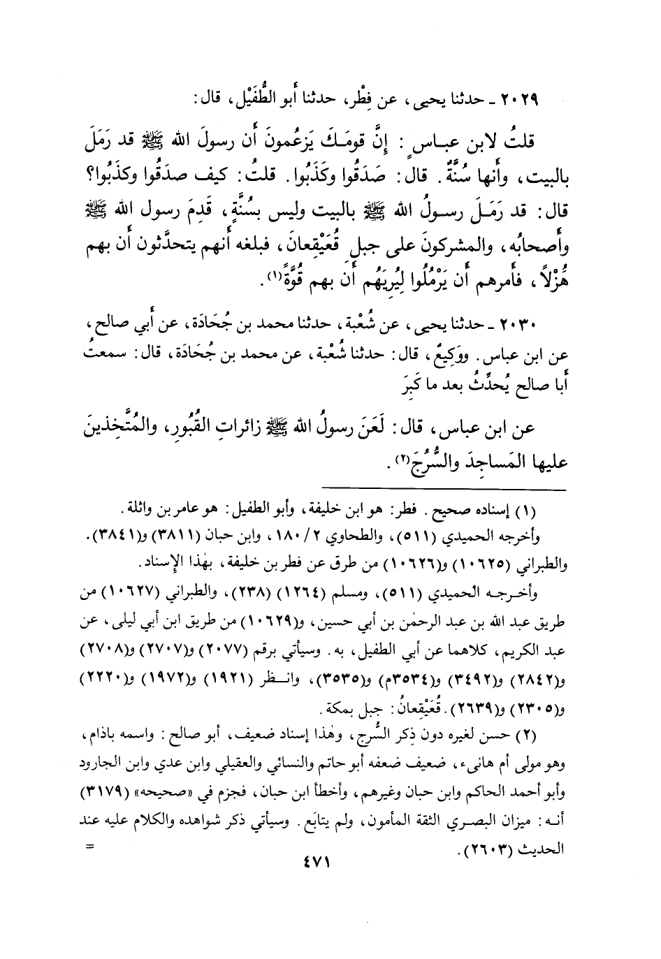 ٢٠٣٠ - حَدَّثَنَا يَحْيَى، عَنْ شُعْبَةَ، حَدَّثَنَا مُحَمَّدُ بْنُ جُحَادَةَ، عَنْ أَبِي صَالِحٍ، عَنِ ابْنِ عَبَّاسٍ، وَوَكِيعٌ، قَالَ: حَدَّثَنَا شُعْبَةُ، عَنْ مُحَمَّدِ بْنِ جُحَادَةَ، قَالَ: سَمِعْتُ أَبَا صَالِحٍ، يُحَدِّثُ - بَعْدَ مَا كَبِرَ - عَنِ ابْنِ عَبَّاسٍ، قَالَ: " لَعَنَ رَسُولُ اللهِ صَلَّى اللهُ عَلَيْهِ وَسَلَّمَ زَائِرَاتِ الْقُبُورِ، وَالْمُتَّخِذِينَ عَلَيْهَا الْمَسَاجِدَ وَالسُّرُجَ " (٢)