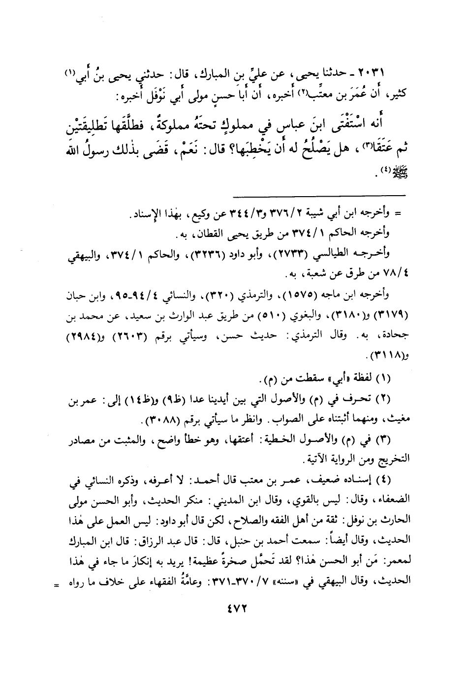 ٢٠٣١ - حَدَّثَنَا يَحْيَى، عَنْ عَلِيِّ بْنِ الْمُبَارَكِ، قَالَ: حَدَّثَنِي يَحْيَى بْنُ أَبِي (١) كَثِيرٍ، أَنَّ عُمَرَ بْنَ مُعَتِّبٍ (٢) أَخْبَرَهُ، أَنَّ أَبَا حَسَنٍ مَوْلَى أَبِي نَوْفَلٍ أَخْبَرَهُ، أَنَّهُ اسْتَفْتَى ابْنَ عَبَّاسٍ فِي مَمْلُوكٍ تَحْتَهُ مَمْلُوكَةٌ فَطَلَّقَهَا تَطْلِيقَتَيْنِ، ثُمَّ عَتَقَا (٣) ، هَلْ يَصْلُحُ لَهُ أَنْ يَخْطُبَهَا؟ قَالَ: " نَعَمْ، قَضَى بِذَلِكَ رَسُولُ اللهِ صَلَّى اللهُ عَلَيْهِ وَسَلَّمَ " (٤)