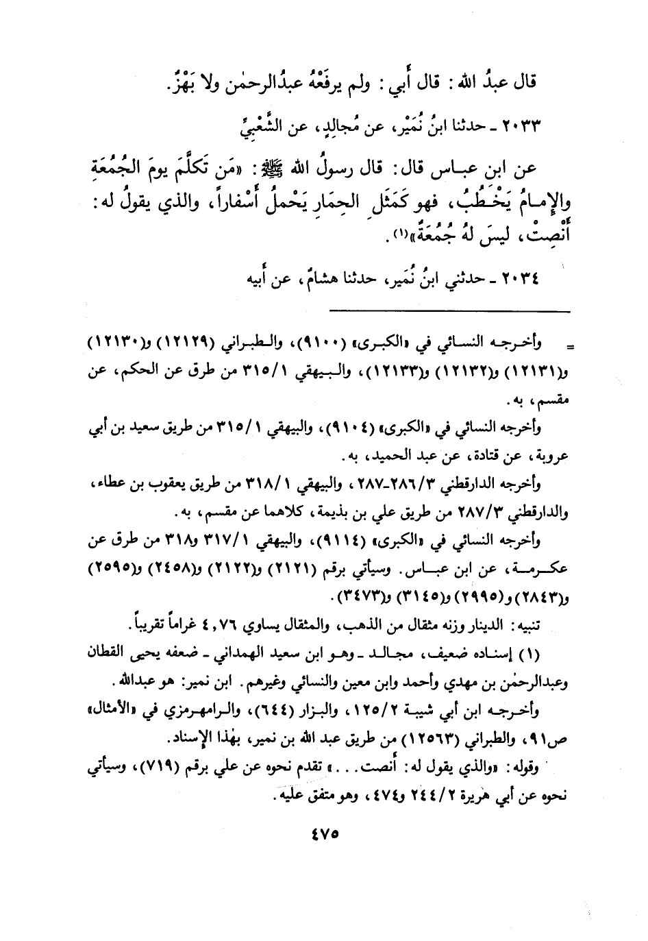 ٢٠٣٣ - حَدَّثَنَا ابْنُ نُمَيْرٍ، عَنْ مُجَالِدٍ، عَنِ الشَّعْبِيِّ، عَنِ ابْنِ عَبَّاسٍ، قَالَ: قَالَ رَسُولُ اللهِ صَلَّى اللهُ عَلَيْهِ وَسَلَّمَ: " مَنْ تَكَلَّمَ يَوْمَ الْجُمُعَةِ وَالْإِمَامُ يَخْطُبُ، فَهُوَ كَمَثَلِ الْحِمَارِ يَحْمِلُ أَسْفَارًا، وَالَّذِي يَقُولُ لَهُ: أَنْصِتْ، لَيْسَ لَهُ جُمُعَةٌ " (١)