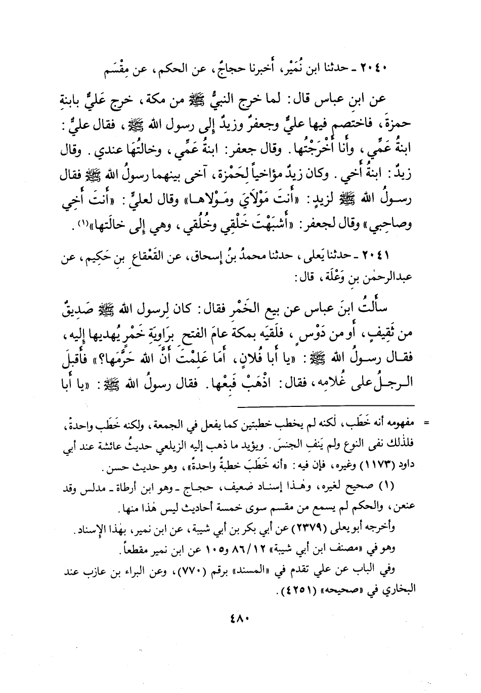 ٢٠٤٠ - حَدَّثَنَا ابْنُ نُمَيْرٍ، أَخْبَرَنَا حَجَّاجٌ، عَنِ الْحَكَمِ، عَنْ مِقْسَمٍ، عَنِ ابْنِ عَبَّاسٍ، قَالَ: لَمَّا خَرَجَ النَّبِيُّ صَلَّى اللهُ عَلَيْهِ وَسَلَّمَ مِنْ مَكَّةَ، خَرَجَ عَلِيٌّ بِابْنَةِ حَمْزَةَ، فَاخْتَصَمَ فِيهَا عَلِيٌّ، وَجَعْفَرٌ، وَزَيْدٌ إِلَى رَسُولِ اللهِ صَلَّى اللهُ عَلَيْهِ وَسَلَّمَ، فَقَالَ عَلِيٌّ: ابْنَةُ عَمِّي وَأَنَا أَخْرَجْتُهَا، وَقَالَ جَعْفَرٌ: ابْنَةُ عَمِّي وَخَالَتُهَا عِنْدِي، وَقَالَ زَيْدٌ: ابْنَةُ أَخِي. وَكَانَ زَيْدٌ مُؤَاخِيًا لِحَمْزَةَ، آخَى بَيْنَهُمَا رَسُولُ اللهِ صَلَّى اللهُ عَلَيْهِ وَسَلَّمَ، فَقَالَ رَسُولُ اللهِ صَلَّى اللهُ عَلَيْهِ وَسَلَّمَ لِزَيْدٍ: " أَنْتَ مَوْلايَ وَمَوْلاهَا " وَقَالَ لِعَلِيٍّ: " أَنْتَ أَخِي وَصَاحِبِي "، وَقَالَ لِجَعْفَرٍ: " أَشْبَهْتَ خَلْقِي وَخُلُقِي وَهِيَ إِلَى خَالَتِهَا " (١)