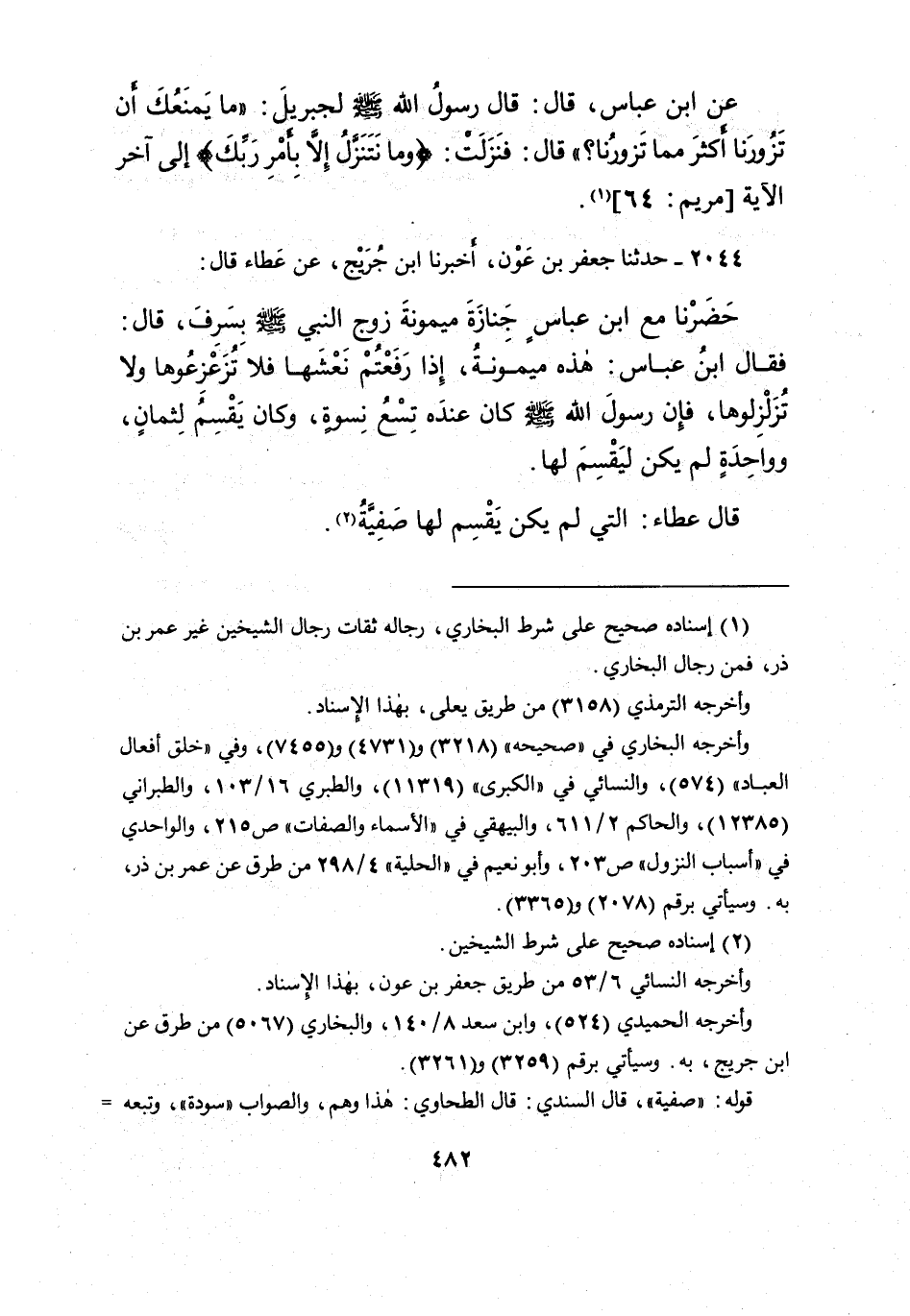 ٢٠٤٤ - حَدَّثَنَا جَعْفَرُ بْنُ عَوْنٍ، أَخْبَرَنَا ابْنُ جُرَيْجٍ، عَنْ عَطَاءٍ، قَالَ: حَضَرْنَا مَعَ ابْنِ عَبَّاسٍ جَنَازَةَ مَيْمُونَةَ زَوْجِ النَّبِيِّ صَلَّى اللهُ عَلَيْهِ وَسَلَّمَ بِسَرِفَ، قَالَ: فَقَالَ ابْنُ عَبَّاسٍ: " هَذِهِ مَيْمُونَةُ، إِذَا رَفَعْتُمْ نَعْشَهَا، فَلا تُزَعْزِعُوهَا، وَلا تُزَلْزِلُوهَا، فَإِنَّ رَسُولَ اللهِ صَلَّى اللهُ عَلَيْهِ وَسَلَّمَ كَانَ عِنْدَهُ تِسْعُ نِسْوَةٍ، وَكَانَ يَقْسِمُ لِثَمَانٍ وَوَاحِدَةٌ، لَمْ يَكُنْ لِيَقْسِمَ لَهَا " قَالَ عَطَاءٌ: الَّتِي لَمْ يَكُنْ يَقْسِمُ لَهَا صَفِيَّةُ (٢)