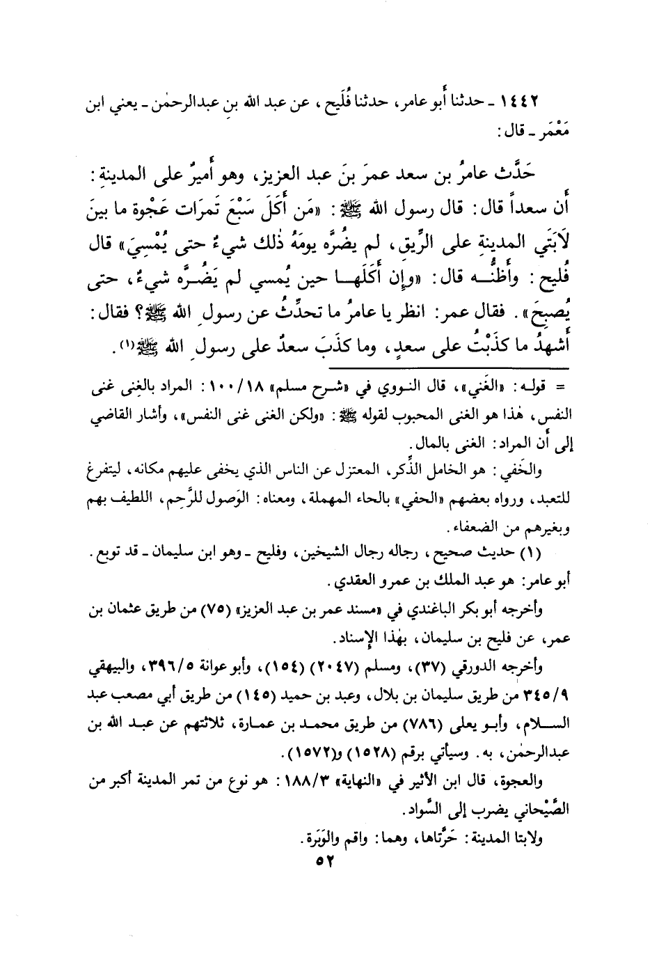 ١٤٤٢ - حَدَّثَنَا أَبُو عَامِرٍ، حَدَّثَنَا فُلَيْحٌ، عَنْ عَبْدِ اللهِ بْنِ عَبْدِ الرَّحْمَنِ يَعْنِي ابْنَ مَعْمَرٍ، قَالَ: حَدَّثَ عَامِرُ بْنُ سَعْدٍ عُمَرَ بْنَ عَبْدِ الْعَزِيزِ - وَهُوَ أَمِيرٌ عَلَى الْمَدِينَةِ - أَنَّ سَعْدًا، قَالَ: قَالَ رَسُولُ اللهِ صَلَّى اللهُ عَلَيْهِ وَسَلَّمَ: " مَنْ أَكَلَ سَبْعَ تَمَرَاتِ عَجْوَةٍ مِنْ بَيْنَ لابَتَيِ الْمَدِينَةِ عَلَى الرِّيقِ، لَمْ يَضُرَّهُ يَوْمَهُ ذَلِكَ شَيْءٌ حَتَّى يُمْسِيَ " قَالَ فُلَيْحٌ: وَأَظُنُّهُ قَالَ: " وَإِنْ أَكَلَهَا حِينَ يُمْسِي لَمْ يَضُرَّهُ شَيْءٌ حَتَّى يُصْبِحَ ". فَقَالَ عُمَرُ: انْظُرْ يَا عَامِرُ مَا تُحَدِّثُ عَنْ رَسُولِ اللهِ صَلَّى اللهُ عَلَيْهِ وَسَلَّمَ. فَقَالَ: أَشْهَدُ مَا كَذَبْتُ عَلَى سَعْدٍ، وَمَا كَذَبَ سَعْدٌ عَلَى رَسُولِ اللهِ صَلَّى اللهُ عَلَيْهِ وَسَلَّمَ (١)