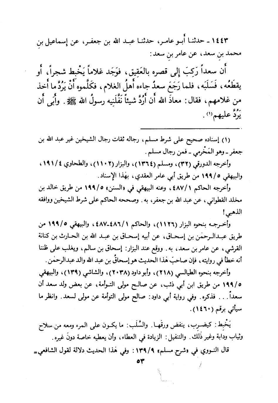 ١٤٤٣ - حَدَّثَنَا أَبُو عَامِرٍ، حَدَّثَنَا عَبْدُ اللهِ بْنُ جَعْفَرٍ، عَنْ إِسْمَاعِيلَ بْنِ مُحَمَّدِ بْنِ سَعْدٍ، عَنْ عَامِرِ بْنِ سَعْدٍ، أَنَّ سَعْدًا، رَكِبَ إِلَى قَصْرِهِ بِالْعَقِيقِ، فَوَجَدَ غُلامًا يَخْبِطُ شَجَرًا - أَوْ يَقْطَعُهُ - فَسَلَبَهُ، فَلَمَّا رَجَعَ سَعْدٌ جَاءَهُ أَهْلُ الْغُلامِ فَكَلَّمُوهُ أَنْ يَرُدَّ مَا أَخَذَ مِنْ غُلامِهِمْ. فَقَالَ: " مَعَاذَ اللهِ أَنْ أَرُدَّ شَيْئًا نَفَّلَنِيهِ رَسُولُ اللهِ صَلَّى اللهُ عَلَيْهِ وَسَلَّمَ، وَأَبَى أَنْ يَرُدَّ عَلَيْهِمْ " (١)