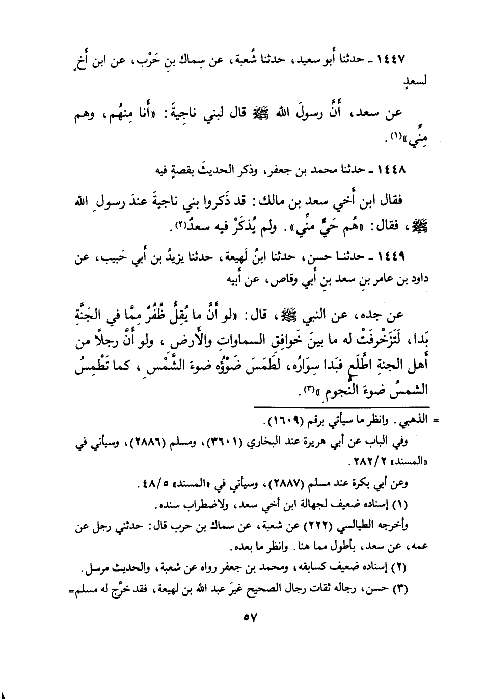١٤٤٨ - حَدَّثَنَا مُحَمَّدُ بْنُ جَعْفَرٍ، وَذَكَرَ الْحَدِيثَ بِقِصَّةٍ فِيهِ، فَقَالَ ابْنُ أَخِي سَعْدِ بْنِ مَالِكٍ: قَدْ ذَكَرُوا بَنِي نَاجِيَةَ عِنْدَ رَسُولِ اللهِ صَلَّى اللهُ عَلَيْهِ وَسَلَّمَ، فَقَالَ: " هُمْ حَيٌّ مِنِّي " وَلَمْ يُذْكَرْ فِيهِ سَعْدٌ (٢)