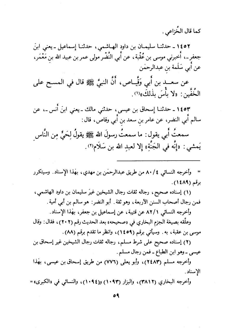 ١٤٥٢ - حَدَّثَنَا سُلَيْمَانُ بْنُ دَاوُدَ الْهَاشِمِيُّ، حَدَّثَنَا إِسْمَاعِيلُ يَعْنِي ابْنَ جَعْفَرٍ، أَخْبَرَنِي مُوسَى بْنُ عُقْبَةَ، عَنْ أَبِي النَّضْرِ، مَوْلَى عُمَرَ بْنِ عُبَيْدِ اللهِ بْنِ مَعْمَرٍ، عَنْ أَبِي سَلَمَةَ بْنِ عَبْدِ الرَّحْمَنِ، عَنْ سَعْدِ بْنِ أَبِي وَقَّاصٍ: أَنَّ النَّبِيَّ صَلَّى اللهُ عَلَيْهِ وَسَلَّمَ قَالَ فِي الْمَسْحِ عَلَى الْخُفَّيْنِ: " لَا بَأْسَ بِذَلِكَ " (١)