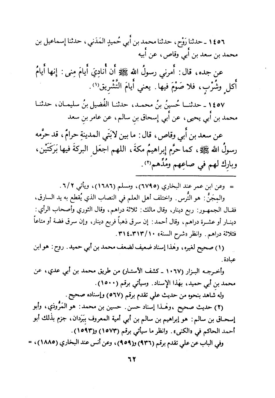 ١٤٥٧ - حَدَّثَنَا حُسَيْنُ بْنُ مُحَمَّدٍ، حَدَّثَنَا الْفُضَيْلُ بْنُ سُلَيْمَانَ، حَدَّثَنَا مُحَمَّدُ بْنُ أَبِي يَحْيَى، عَنْ أَبِي إِسْحَاقَ بْنِ سَالِمٍ، عَنْ عَامِرِ بْنِ سَعْدٍ، عَنْ سَعْدِ بْنِ أَبِي وَقَّاصٍ، قَالَ: " مَا بَيْنَ لابَتَيْ الْمَدِينَةِ حَرَامٌ، قَدْ حَرَّمَهُ رَسُولُ اللهِ صَلَّى اللهُ عَلَيْهِ وَسَلَّمَ، كَمَا حَرَّمَ إِبْرَاهِيمُ مَكَّةَ، اللهُمَّ اجْعَلِ الْبَرَكَةَ فِيهَا بَرَكَتَيْنِ، وَبَارِكْ لَهُمْ فِي صَاعِهِمْ وَمُدِّهِمْ " (٢)