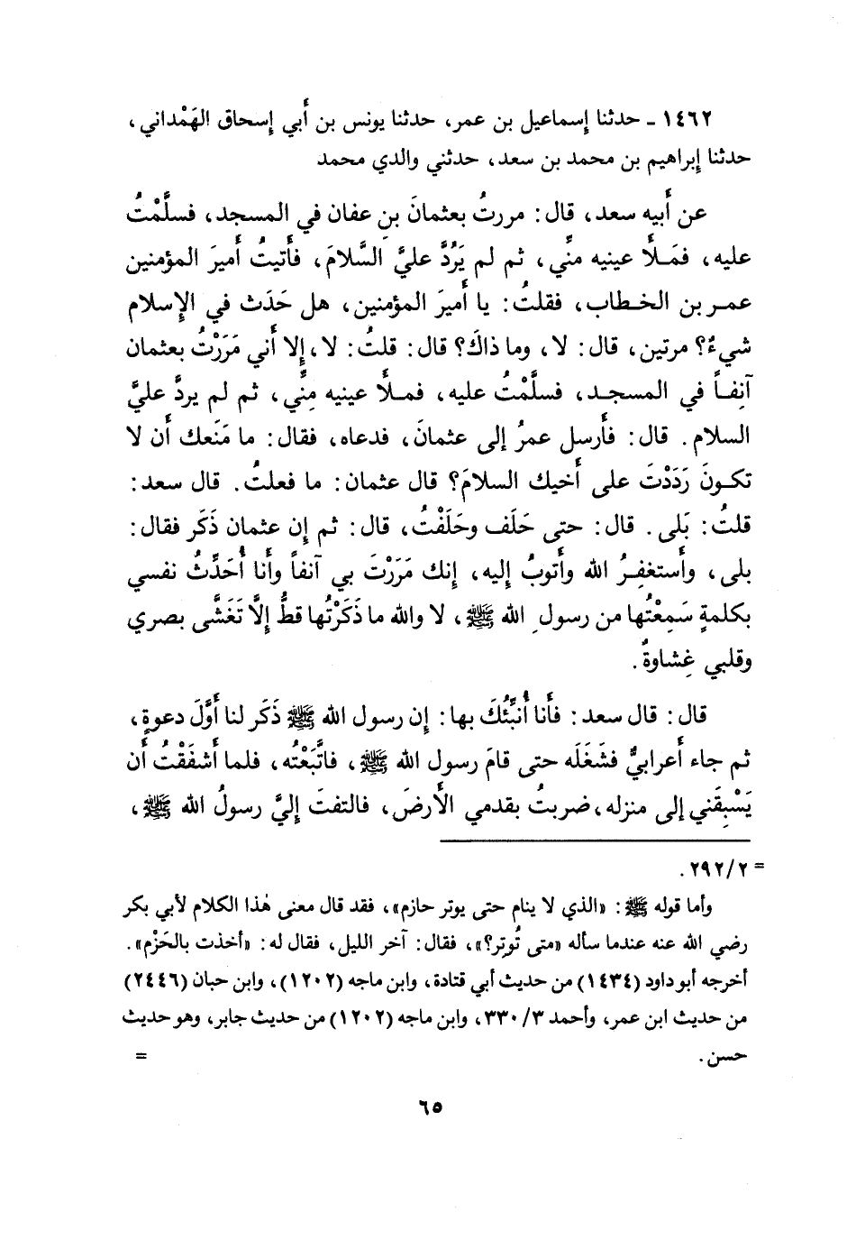 ١٤٦٢ - حَدَّثَنَا إِسْمَاعِيلُ بْنُ عُمَرَ، حَدَّثَنَا يُونُسُ بْنُ أَبِي إِسْحَاقَ الْهَمْدَانِيُّ، حَدَّثَنَا إِبْرَاهِيمُ بْنُ مُحَمَّدِ بْنِ سَعْدٍ، حَدَّثَنِي وَالِدِي مُحَمَّدٌ، عَنِ أبِيهِ سَعْدٍ، قَالَ: مَرَرْتُ بِعُثْمَانَ بْنِ عَفَّانَ فِي الْمَسْجِدِ فَسَلَّمْتُ عَلَيْهِ، فَمَلأ عَيْنَيْهِ مِنِّي ثُمَّ لَمْ يَرُدَّ عَلَيَّ السَّلامَ، فَأَتَيْتُ أَمِيرَ الْمُؤْمِنِينَ عُمَرَ بْنَ الْخَطَّابِ، فَقُلْتُ: يَا أَمِيرَ الْمُؤْمِنِينَ، هَلْ حَدَثَ فِي الْإِسْلامِ شَيْءٌ؟ مَرَّتَيْنِ قَالَ: لَا. وَمَا ذَاكَ؟ قَالَ: قُلْتُ: لَا. إِلا أَنِّي مَرَرْتُ بِعُثْمَانَ آنِفًا فِي الْمَسْجِدِ، فَسَلَّمْتُ عَلَيْهِ فَمَلأ عَيْنَيْهِ مِنِّي، ثُمَّ لَمْ يَرُدَّ عَلَيَّ السَّلامَ. قَالَ: فَأَرْسَلَ عُمَرُ إِلَى عُثْمَانَ فَدَعَاهُ، فَقَالَ: مَا مَنَعَكَ أَنْ لَا تَكُونَ رَدَدْتَ عَلَى أَخِيكَ السَّلامَ؟ قَالَ عُثْمَانُ: مَا فَعَلْتُ قَالَ سَعْدٌ: قُلْتُ: بَلَى. قَالَ: حَتَّى حَلَفَ وَحَلَفْتُ، قَالَ: ثُمَّ إِنَّ عُثْمَانَ ذَكَرَ، فَقَالَ: بَلَى، وَأَسْتَغْفِرُ اللهَ وَأَتُوبُ إِلَيْهِ إِنَّكَ مَرَرْتَ بِي آنِفًا، وَأَنَا أُحَدِّثُ نَفْسِي بِكَلِمَةٍ سَمِعْتُهَا مِنْ رَسُولِ اللهِ صَلَّى اللهُ عَلَيْهِ وَسَلَّمَ، لَا وَاللهِ مَا ذَكَرْتُهَا قَطُّ إِلا تَغَشَّى بَصَرِي وَقَلْبِي غِشَاوَةٌ، قَالَ: قَالَ سَعْدٌ: فَأَنَا أُنْبِئُكَ بِهَا: إِنَّ رَسُولَ اللهِ صَلَّى اللهُ عَلَيْهِ وَسَلَّمَ ذَكَرَ لَنَا أَوَّلَ دَعْوَةٍ، ثُمَّ جَاءَ أَعْرَابِيٌّ فَشَغَلَهُ حَتَّى قَامَ رَسُولُ اللهِ صَلَّى اللهُ عَلَيْهِ وَسَلَّمَ، فَاتَّبَعْتُهُ فَلَمَّا أَشْفَقْتُ أَنْ يَسْبِقَنِي إِلَى مَنْزِلِهِ، ضَرَبْتُ بِقَدَمِي الْأَرْضَ، فَالْتَفَتَ إِلَيَّ رَسُولُ اللهِ صَلَّى اللهُ عَلَيْهِ وَسَلَّمَ: