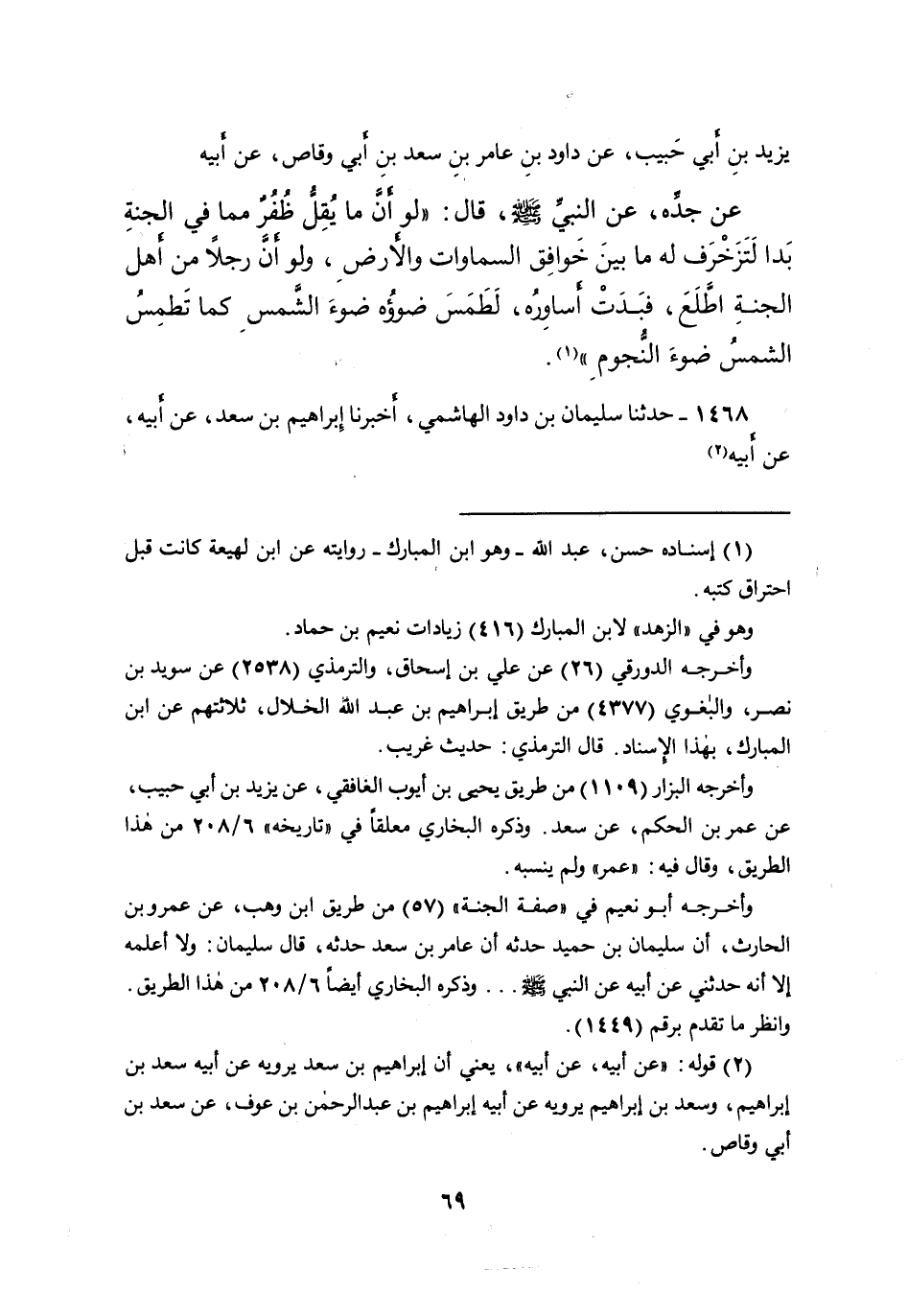 يَزِيدَ بْنِ أَبِي حَبِيبٍ، عَنْ دَاوُدَ بْنِ عَامِرِ بْنِ سَعْدِ بْنِ أَبِي وَقَّاصٍ، عَنْ أَبِيهِ، عَنْ جَدِّهِ، عَنِ النَّبِيِّ صَلَّى اللهُ عَلَيْهِ وَسَلَّمَ قَالَ: " لَوِ أنَّ مَا يُقِلُّ ظُفُرٌ مِمَّا فِي الْجَنَّةِ بَدَا، لَتَزَخْرَفَ لَهُ مَا بَيْنَ خَوَافِقِ السَّمَاوَاتِ وَالْأَرْضِ، وَلَوْ أنَّ رَجُلًا مِنْ أَهْلِ الْجَنَّةِ اطَّلَعَ فَبَدَتْ أَسَاوِرُهُ لَطَمَسَ ضَوْؤُهُ ضَوْءَ الشَّمْسِ، كَمَا تَطْمِسُ الشَّمْسُ ضَوْءَ النُّجُومِ " (١)