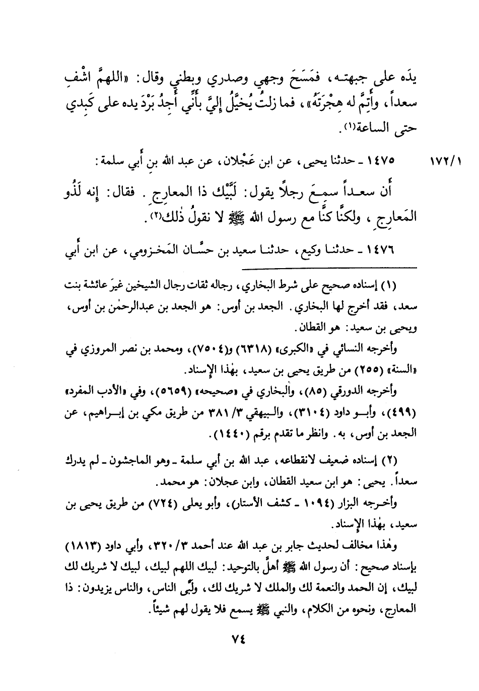 ١٤٧٥ - حَدَّثَنَا يَحْيَى، عَنِ ابْنِ عَجْلانَ، عَنْ عَبْدِ اللهِ بْنِ أَبِي سَلَمَةَ، أَنَّ سَعْدًا، سَمِعَ رَجُلًا يَقُولُ: لَبَّيْكَ ذَا الْمَعَارِجِ، فَقَالَ: " إِنَّهُ لَذُو الْمَعَارِجِ، وَلَكِنَّا كُنَّا مَعَ رَسُولِ اللهِ صَلَّى اللهُ عَلَيْهِ وَسَلَّمَ لَا نَقُولُ ذَلِكَ " (٢)
