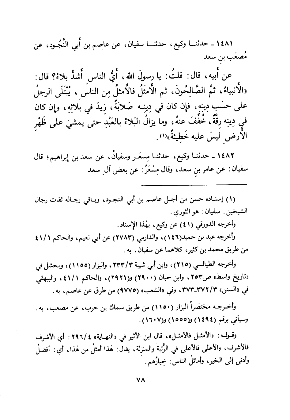 ١٤٨١ - حَدَّثَنَا وَكِيعٌ، حَدَّثَنَا سُفْيَانُ، عَنْ عَاصِمِ بْنِ أَبِي النَّجُودِ، عَنْ مُصْعَبِ بْنِ سَعْدٍ، عَنْ أَبِيهِ، قَالَ: قُلْتُ: يَا رَسُولَ اللهِ أَيُّ النَّاسِ أَشَدُّ بَلاءً؟ قَالَ: " الْأَنْبِيَاءُ، ثُمَّ الصَّالِحُونَ، ثُمَّ الْأَمْثَلُ، فَالْأَمْثَلُ مِنَ النَّاسِ، يُبْتَلَى الرَّجُلُ عَلَى حَسَبِ دِينِهِ، فَإِنْ كَانَ فِي دِينِهِ صَلابَةٌ زِيدَ فِي بَلائِهِ، وَإِنْ كَانَ فِي دِينِهِ رِقَّةٌ خُفِّفَ عَنْهُ، وَمَا يَزَالُ الْبَلاءُ بِالْعَبْدِ حَتَّى يَمْشِيَ عَلَى ظَهْرِ الْأَرْضِ لَيْسَ عَلَيْهِ خَطِيئَةٌ " (١)