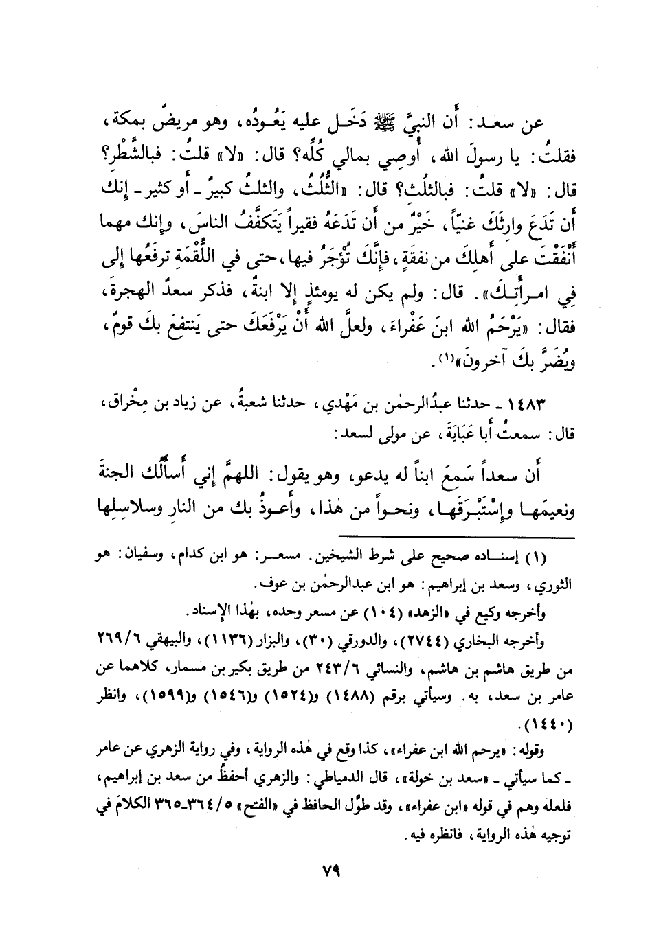 ١٤٨٣ - حَدَّثَنَا عَبْدُ الرَّحْمَنِ بْنُ مَهْدِيٍّ، حَدَّثَنَا شُعْبَةُ، عَنْ زِيَادِ بْنِ مِخْرَاقٍ، قَالَ: سَمِعْتُ أَبَا نَعَامَةَ، عَنْ مَوْلًى لِسَعْدٍ: أَنَّ سَعْدًا سَمِعَ ابْنًا لَهُ يَدْعُو، وَهُوَ يَقُولُ: اللهُمَّ إِنِّي أَسْأَلُكَ الْجَنَّةَ وَنَعِيمَهَا وَإِسْتَبْرَقَهَا، وَنَحْوًا مِنْ هَذَا، وَأَعُوذُ بِكَ مِنَ النَّارِ وَسَلاسِلِهَا