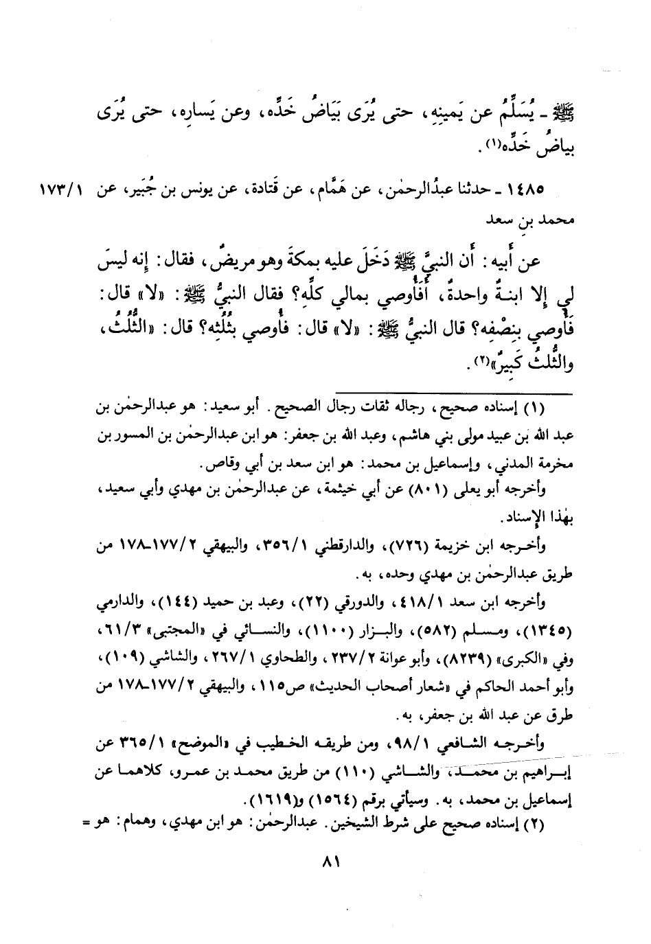 ١٤٨٥ - حَدَّثَنَا عَبْدُ الرَّحْمَنِ، عَنْ هَمَّامٍ، عَنْ قَتَادَةَ، عَنْ يُونُسَ بْنِ جُبَيْرٍ، عَنْ مُحَمَّدِ بْنِ سَعْدٍ، عَنْ أَبِيهِ، أَنَّ النَّبِيَّ صَلَّى اللهُ عَلَيْهِ وَسَلَّمَ دَخَلَ عَلَيْهِ بِمَكَّةَ وَهُوَ مَرِيضٌ، فَقَالَ: إِنَّهُ لَيْسَ لِي إِلا ابْنَةٌ وَاحِدَةٌ، أفَأُوصِِي بِمَالِي كُلِّهِ؟ فَقَالَ النَّبِيُّ صَلَّى اللهُ عَلَيْهِ وَسَلَّمَ: " لَا "، قَالَ: فَأُوصِي بِنِصْفِهِ؟ قَالَ النَّبِيُّ صَلَّى اللهُ عَلَيْهِ وَسَلَّمَ: " لَا " قَالَ: فَأُوصِي بِثُلُثِهِ؟ قَالَ: " الثُّلُثُ وَالثُّلُثُ كَبِيرٌ " (٢)