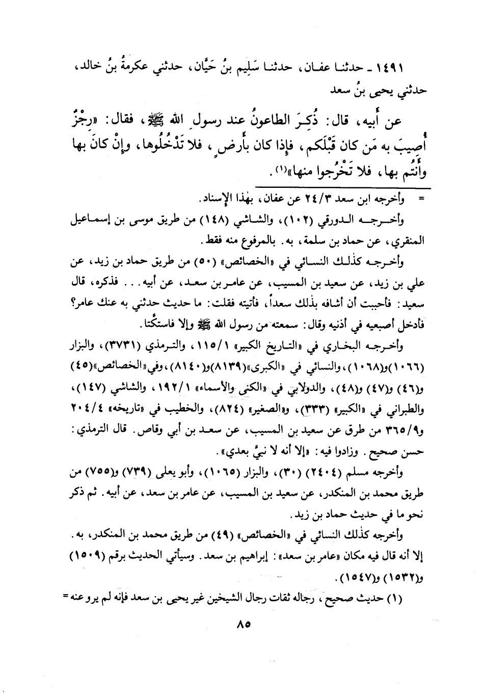 ١٤٩١ - حَدَّثَنَا عَفَّانُ، حَدَّثَنَا سَلِيمُ بْنُ حَيَّانَ، حَدَّثَنِي عِكْرِمَةُ بْنُ خَالِدٍ، حَدَّثَنِي يَحْيَى بْنُ سَعْدٍ، عَنْ أَبِيهِ، قَالَ: ذُكِرَ الطَّاعُونُ عِنْدَ رَسُولِ اللهِ صَلَّى اللهُ عَلَيْهِ وَسَلَّمَ فَقَالَ: " رِجْزٌ أُصِيبَ بِهِ مَنْ كَانَ قَبْلَكُمْ، فَإِذَا كَانَ بِأَرْضٍ فَلا تَدْخُلُوهَا، وَإِذَا كَانَ بِهَا وَأَنْتُمْ بِهَا فَلا تَخْرُجُوا مِنْهَا " (١)