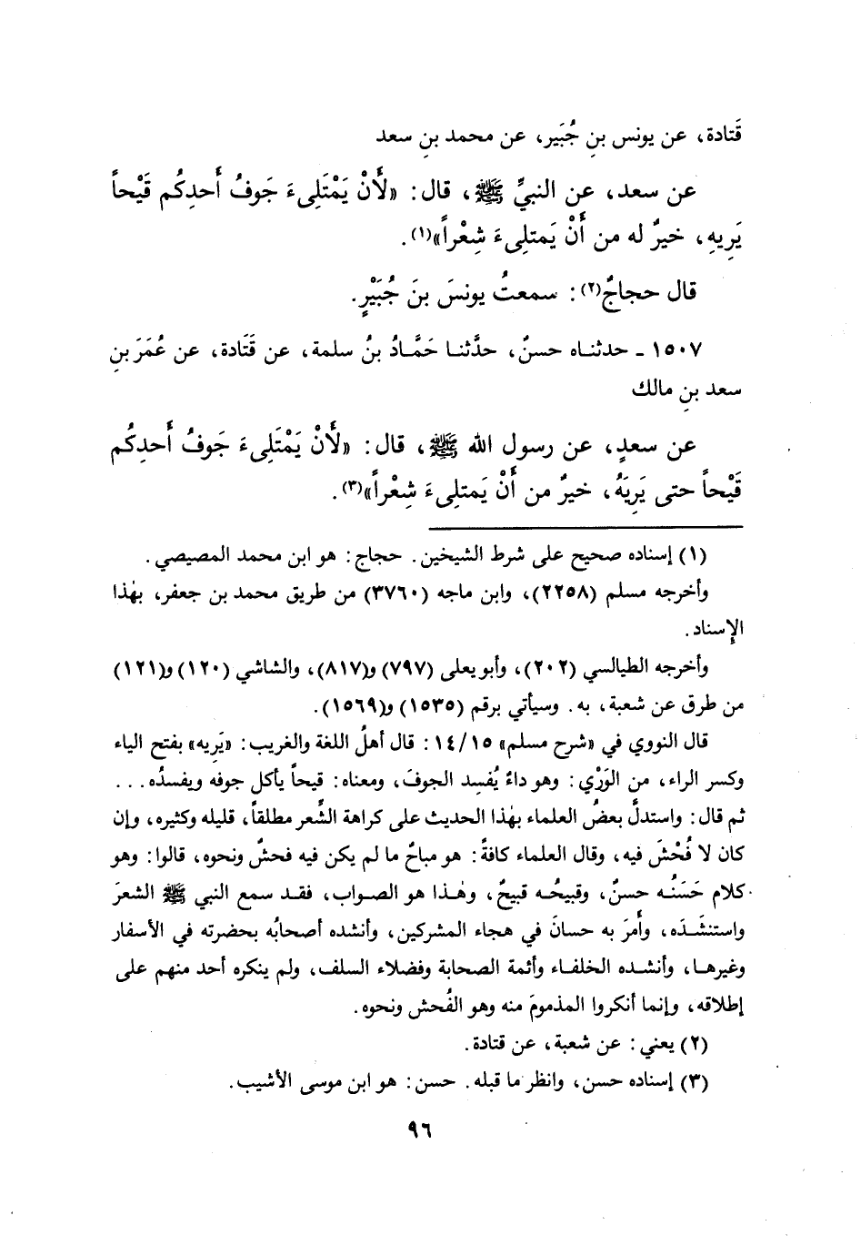 ١٥٠٧ - حَدَّثَنَاه حَسَنٌ، حَدَّثَنَا حَمَّادُ بْنُ سَلَمَةَ، عَنْ قَتَادَةَ، عَنْ عُمَرَ بْنِ سَعْدِ بْنِ مَالِكٍ، عَنْ سَعْدٍ، عَنْ رَسُولِ اللهِ صَلَّى اللهُ عَلَيْهِ وَسَلَّمَ قَالَ: " لأنْ يَمْتَلِئَ جَوْفُ أَحَدِكُمْ قَيْحًا حَتَّى يَرِيَهُ خَيْرٌ مِنْ أَنْ يَمْتَلِئَ شِعْرًا " (٣)