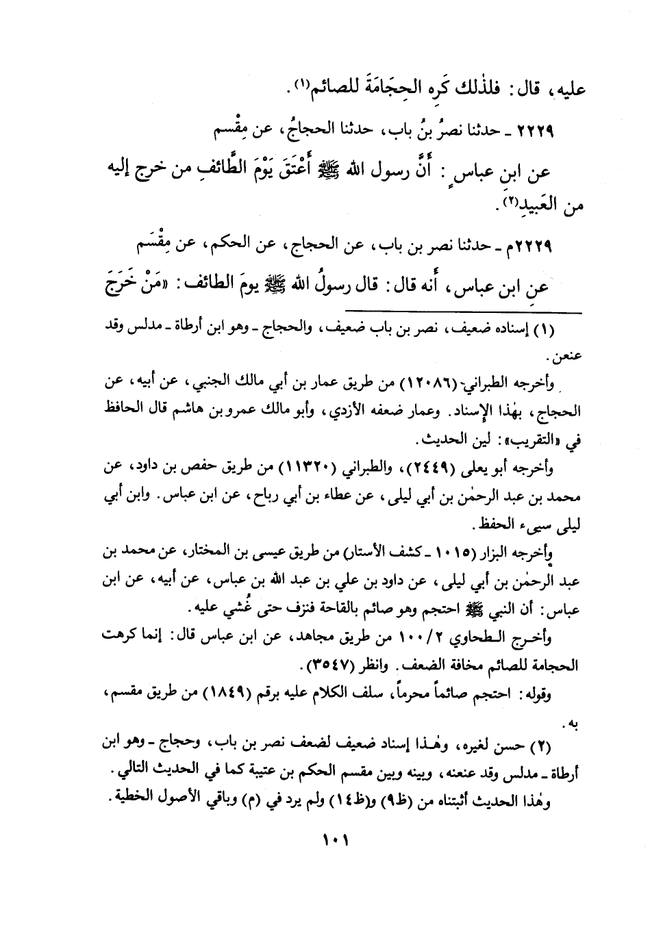٢٢٢٩ م - حَدَّثَنَا نَصْرُ بْنُ بَابٍ، عَنِ الْحَجَّاجِ، عَنِ الحَكَمِ، عَنْ مِقْسَمٍ، عَنِ ابْنِ عَبَّاسٍ، أَنَّهُ قَالَ: قَالَ رَسُولَ اللهِ صَلَّى اللهُ عَلَيْهِ وَسَلَّمَ يَوْمَ الطَّائِفِ: " مَنْ خَرَجَ