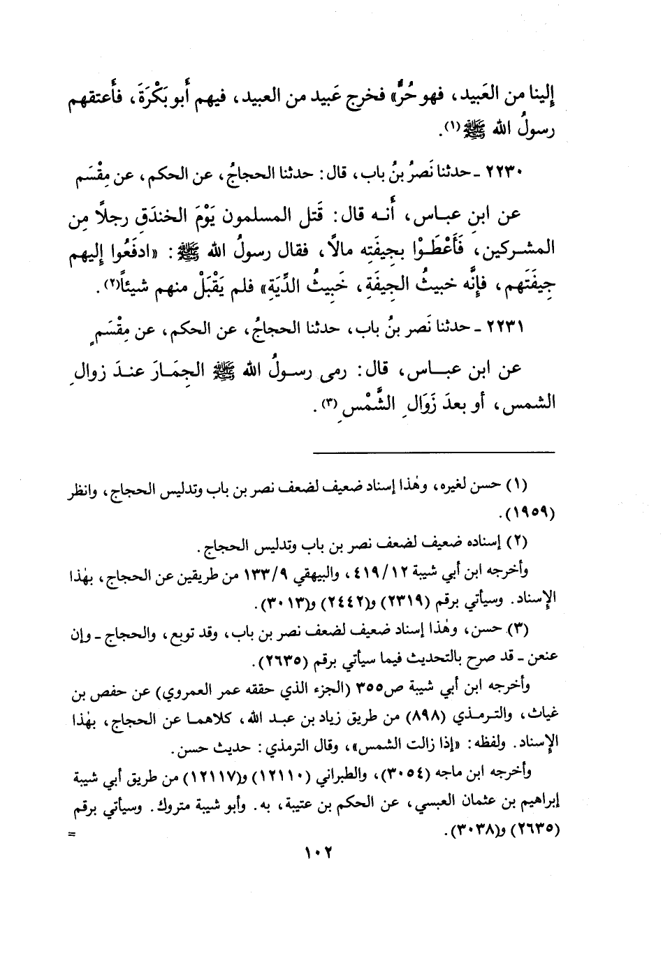 ٢٢٣١ - حَدَّثَنَا نَصْرُ بْنُ بَابٍ، حَدَّثَنَا الْحَجَّاجُ، عَنِ الْحَكَمِ، عَنْ مِقْسَمٍ، عَنِ ابْنِ عَبَّاسٍ، قَالَ: " رَمَى رَسُولُ اللهِ صَلَّى اللهُ عَلَيْهِ وَسَلَّمَ، الْجِمَارَ عِنْدَ زَوَالِ الشَّمْسِ أَوْ بَعْدَ زَوَالِ الشَّمْسِ " (٣)
