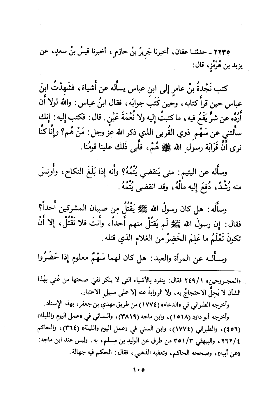 ٢٢٣٥ - حَدَّثَنَا عَفَّانُ، أَخْبَرَنَا جَرِيرُ بْنُ حَازِمٍ، أَخْبَرَنَا قَيْسُ بْنُ سَعْدٍ، عَنْ يَزِيدَ بْنِ هُرْمُزَ، قَالَ: كَتَبَ نَجْدَةُ بْنُ عَامِرٍ إِلَى ابْنِ عَبَّاسٍ يَسْأَلُهُ عَنِ أشْيَاءَ، فَشَهِدْتُ ابْنَ عَبَّاسٍ حِينَ قَرَأَ كِتَابَهُ، وَحِينَ كَتَبَ جَوَابَهُ، فَقَالَ ابْنُ عَبَّاسٍ: وَاللهِ لَوْلَا أَنْ أَرُدَّهُ عَنْ شَرٍّ يَقَعُ فِيهِ، مَا كَتَبْتُ إِلَيْهِ وَلَا نَعْمَةَ عَيْنٍ، قَالَ: فَكَتَبَ إِلَيْهِ: إِنَّكَ سَأَلْتَنِي عَنْ سَهْمِ ذَوِي الْقُرْبَى الَّذِي ذَكَرَ اللهُ عَزَّ وَجَلَّ: مَنْ هُمْ؟ وَإِنَّا كُنَّا نُرَى أَنَّ قَرَابَةَ رَسُولِ اللهِ صَلَّى اللهُ عَلَيْهِ وَسَلَّمَ هُمْ، فَأَبَى ذَلِكَ عَلَيْنَا قَوْمُنَا، وَسَأَلَهُ عَنِ الْيَتِيمِ: مَتَى يَنْقَضِي يُتْمُهُ؟ وَإِنَّهُ إِذَا بَلَغَ النِّكَاحَ، وَأُونِسَ مِنْهُ رُشْدٌ، دُفِعَ إِلَيْهِ مَالُهُ، وَقَدِ انْقَضَى يُتْمُهُ. وَسَأَلَهُ: هَلْ كَانَ رَسُولُ اللهِ صَلَّى اللهُ عَلَيْهِ وَسَلَّمَ يَقْتُلُ مِنْ صِبْيَانِ الْمُشْرِكِينَ أَحَدًا؟، فَقَالَ: " إِنَّ رَسُولَ اللهِ صَلَّى اللهُ عَلَيْهِ وَسَلَّمَ لَمْ يَقْتُلْ مِنْهُمْ أَحَدًا "، وَأَنْتَ فَلَا تَقْتُلْ، إِلَّا أَنْ تَكُونَ تَعْلَمُ مَا عَلِمَ الْخَضِرُ مِنَ الغُلَامِ الَّذِي قَتَلَهُ. وَسَأَلَهُ عَنِ الْمَرْأَةِ وَالْعَبْدِ: هَلْ كَانَ لَهُمَا سَهْمٌ مَعْلُومٌ إِذَا حَضَرُوا