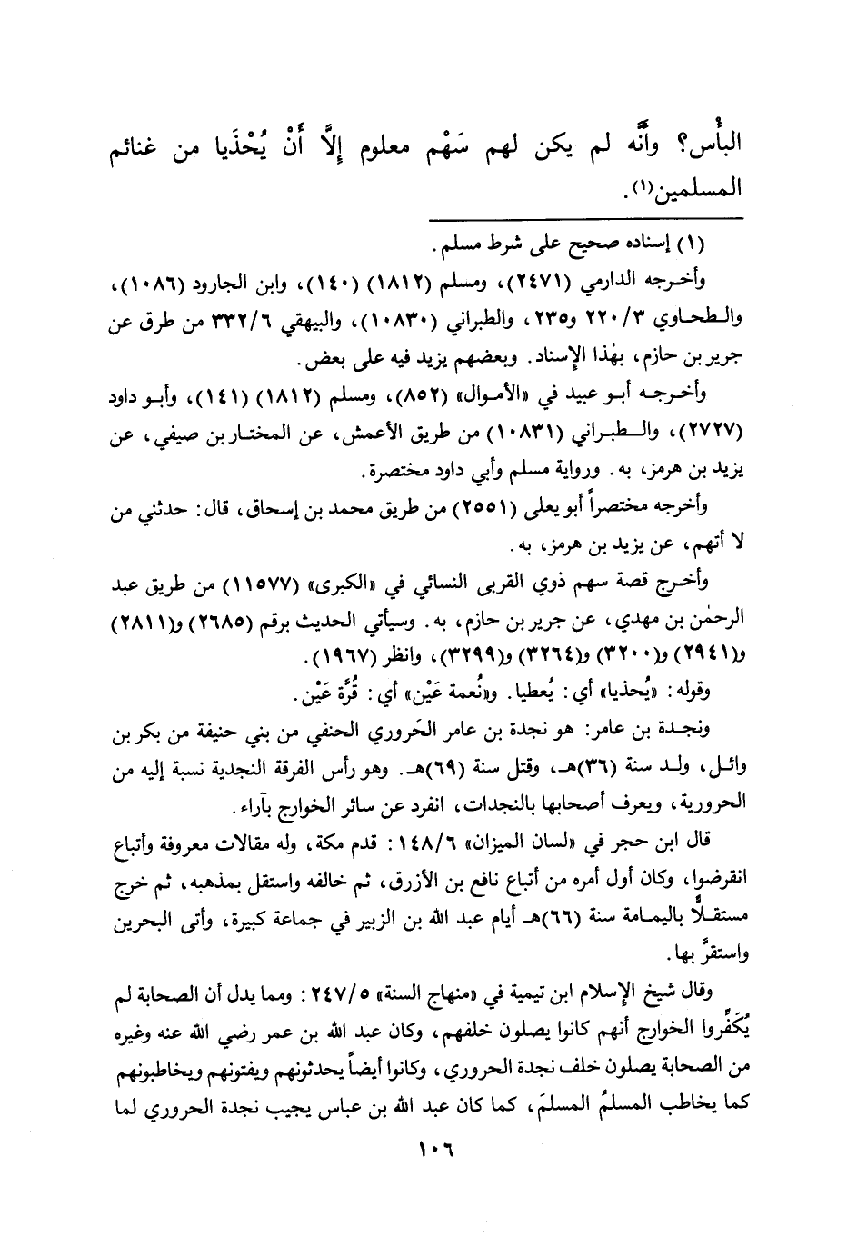 وقال شيخ الإسلام ابن تيمية في "منهاج السنة" ٥/٢٤٧: ومما يدل أن الصحابة لم يُكَفروا الخوارج أنهم كانوا يصلون خلفهم، وكان عبد الله بن عمر رضي الله عنه وغيره من الصحابة يصلون خلف نجدة الحروري، وكانوا أيضاً يحدثونهم ويفتونهم ويخاطبونهم كما يخاطب المسلمُ المسلمَ، كما كان عبد الله بن عباس يجيب نجدة الحروري لما=