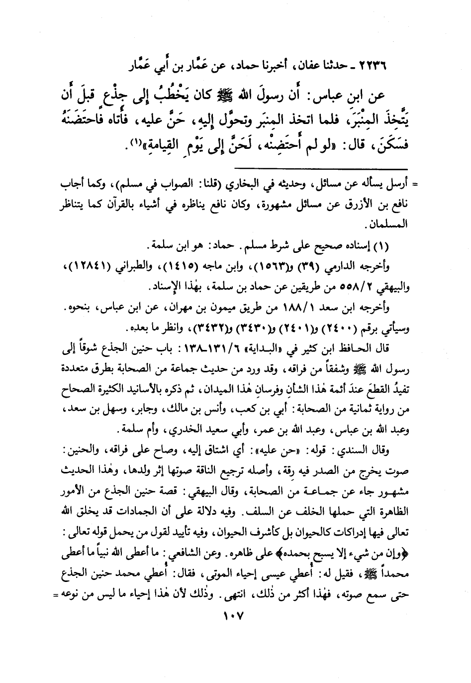 ٢٢٣٦ - حَدَّثَنَا عَفَّانُ، أَخْبَرَنَا حَمَّادٌ، عَنْ عَمَّارِ بْنِ أَبِي عَمَّارٍ، عَنِ ابْنِ عَبَّاسٍ: أَنَّ رَسُولَ اللهِ صَلَّى اللهُ عَلَيْهِ وَسَلَّمَ، كَانَ يَخْطُبُ إِلَى جِذْعٍ قَبْلَ أَنْ يَتَّخِذَ الْمِنْبَرَ، فَلَمَّا اتَّخَذَ الْمِنْبَرَ وَتَحَوَّلَ إِلَيْهِ، حَنَّ عَلَيْهِ، فَأَتَاهُ فَاحْتَضَنَهُ فَسَكَنَ، قَالَ: " لَوْ لَمْ أَحْتَضِنْهُ، لَحَنَّ إِلَى يَوْمِ الْقِيَامَةِ " (١)