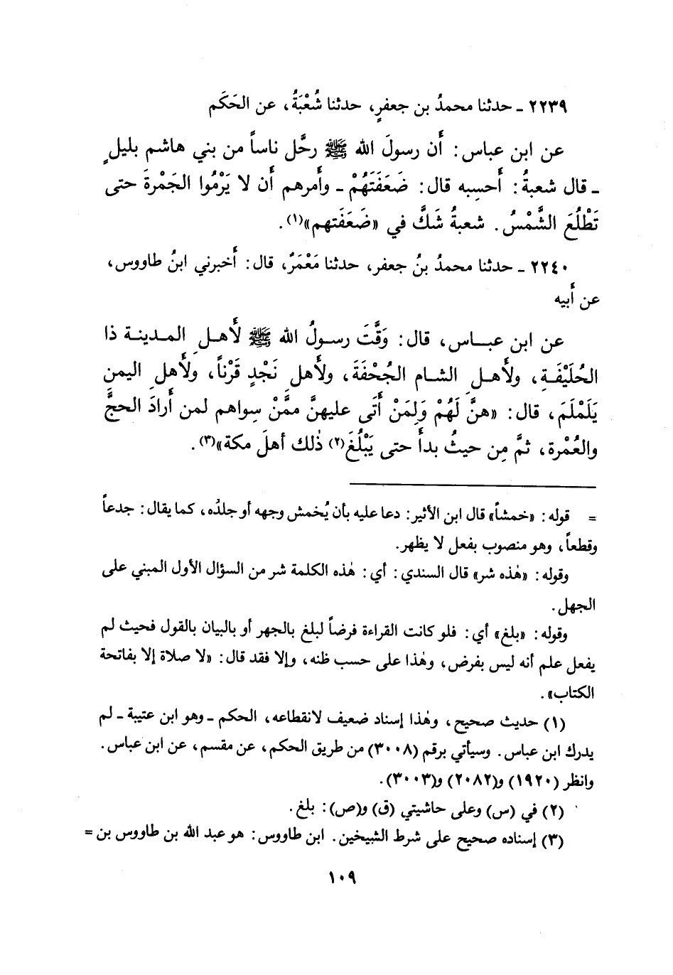 ٢٢٣٩ - حَدَّثَنَا مُحَمَّدُ بْنُ جَعْفَرٍ، حَدَّثَنَا شُعْبَةُ، عَنِ الْحَكَمِ، عَنِ ابْنِ عَبَّاسٍ: " أَنَّ رَسُولَ اللهِ صَلَّى اللهُ عَلَيْهِ وَسَلَّمَ، رَحَّلَ نَاسًا مِنْ بَنِي هَاشِمٍ بِلَيْلٍ - قَالَ شُعْبَةُ: أَحْسَبُهُ قَالَ: ضَعَفَتَهُمْ - وَأَمَرَهُمْ أَنْ لَا يَرْمُوا الْجَمْرَةَ حَتَّى تَطْلُعَ الشَّمْسُ " شُعْبَةُ شَكَّ فِي ضَعَفَتَهُمْ (١)