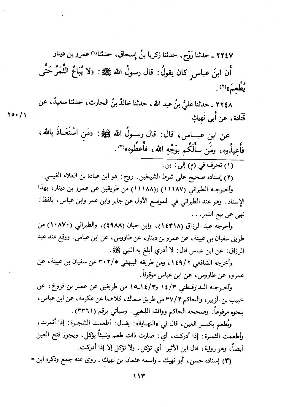 ٢٢٤٧ - حَدَّثَنَا رَوْحٌ، حَدَّثَنَا (١) زَكَرِيَّا بْنُ إِسْحَاقَ، حَدَّثَنَا عَمْرُو بْنُ دِينَارٍ، أَنَّ ابْنَ عَبَّاسٍ كَانَ يَقُولُ: قَالَ رَسُولُ اللهِ صَلَّى اللهُ عَلَيْهِ وَسَلَّمَ: " لَا يُبَاعُ الثَّمَرُ حَتَّى يُطْعَمَ (٢)