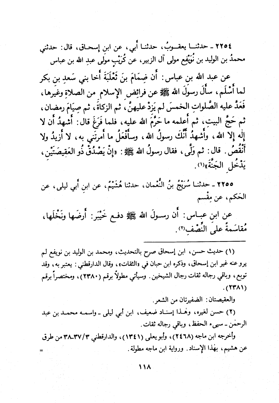 ٢٢٥٤ - حَدَّثَنَا يَعْقُوبُ، حَدَّثَنَا أَبِي، عَنِ ابْنِ إِسْحَاقَ، قَالَ: حَدَّثَنِى مُحَمَّدُ بْنُ الْوَلِيدِ بْنِ نُوَيْفِعٍ، مَوْلَى آلِ الزُّبَيْرِ، عَنْ كُرَيْبٍ مَوْلَى عَبْدِ اللهِ بْنِ عَبَّاسٍ، عَنْ عَبْدِ اللهِ بْنِ عَبَّاسٍ، أَنَّ ضِمَامَ بْنَ ثَعْلَبَةَ، أَخَا بَنِي سَعْدِ بْنِ بَكْرٍ لَمَّا أَسْلَمَ، سَأَلَ رَسُولَ اللهِ صَلَّى اللهُ عَلَيْهِ وَسَلَّمَ عَنْ فَرَائِضِ الْإِسْلامِ مِنَ الصَّلاةِ وَغَيْرِهَا، فَعَدَّ عَلَيْهِ الصَّلَوَاتِ الْخَمْسَ لَمْ يَزِدْ عَلَيْهِنَّ، ثُمَّ الزَّكَاةَ، ثُمَّ صِيَامَ رَمَضَانَ، ثُمَّ حَجَّ الْبَيْتِ، ثُمَّ أَعْلَمَهُ مَا حَرَّمَ اللهُ عَلَيْهِ، فَلَمَّا فَرَغَ قَالَ: أَشْهَدُ أَنْ لَا إِلَهَ إِلا اللهُ، وَأَشْهَدُ أَنَّكَ رَسُولُ اللهِ، وَسَأَفْعَلُ مَا أَمَرْتَنِي بِهِ، لَا أَزِيدُ وَلا أَنْقُصُ. قَالَ: ثُمَّ وَلَّى، فَقَالَ رَسُولُ اللهِ صَلَّى اللهُ عَلَيْهِ وَسَلَّمَ: " إِنْ يَصْدُقْ ذُو الْعَقِيصَتَيْنِ يَدْخُلِ الْجَنَّةَ " (١)