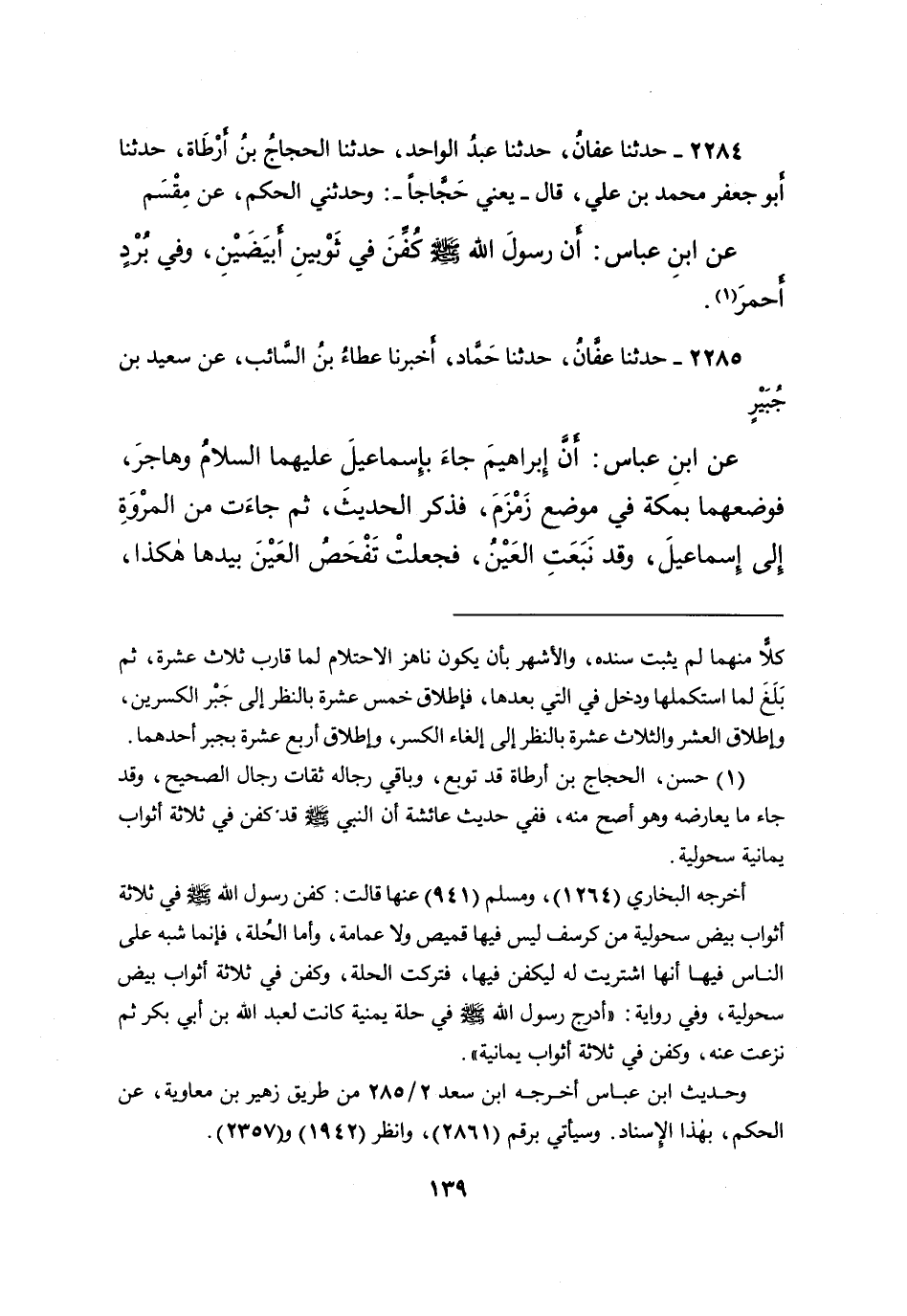 ٢٢٨٤ - حَدَّثَنَا عَفَّانُ، حَدَّثَنَا عَبْدُ الْوَاحِدِ، حَدَّثَنَا الْحَجَّاجُ بْنُ أَرْطَاةَ، حَدَّثَنَا أَبُو جَعْفَرٍ مُحَمَّدُ بْنُ عَلِيٍّ، قَالَ: - يَعْنِي حَجَّاجًا - وَحَدَّثَنِي الْحَكَمُ، عَنْ مِقْسَمٍ، عَنِ ابْنِ عَبَّاسٍ: " أَنَّ رَسُولَ اللهِ صَلَّى اللهُ عَلَيْهِ وَسَلَّمَ، كُفِّنَ فِي ثَوْبَيْنِ أَبْيَضَيْنِ، وَفِي بُرْدٍ أَحْمَرَ " (١)