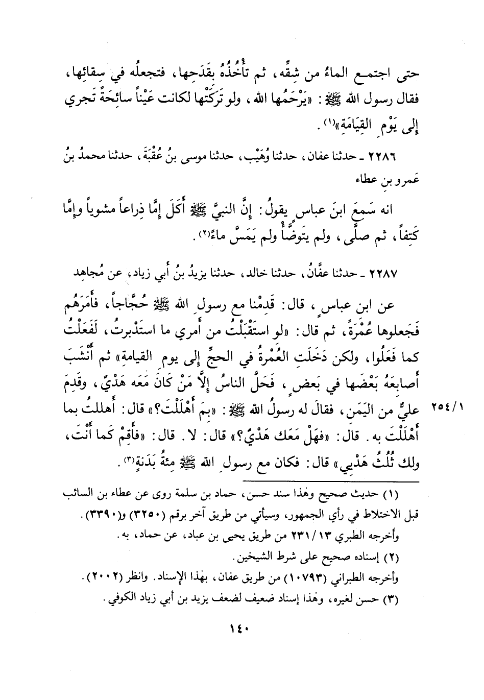 ٢٢٨٧ - حَدَّثَنَا عَفَّانُ، حَدَّثَنَا خَالِدٌ، حَدَّثَنَا يَزِيدُ بْنُ أَبِي زِيَادٍ، عَنْ مُجَاهِدٍ، عَنِ ابْنِ عَبَّاسٍ، قَالَ: قَدِمْنَا مَعَ رَسُولِ اللهِ صَلَّى اللهُ عَلَيْهِ وَسَلَّمَ حُجَّاجًا، فَأَمَرَهُمْ فَجَعَلُوهَا عُمْرَةً، ثُمَّ قَالَ: " لَوِ اسْتَقْبَلْتُ مِنْ أَمْرِي مَا اسْتَدْبَرْتُ، لَفَعَلْتُ كَمَا فَعَلُوا، وَلَكِنْ دَخَلَتِ الْعُمْرَةُ فِي الْحَجِّ إِلَى يَوْمِ الْقِيَامَةِ "، ثُمَّ أَنْشَبَ أَصَابِعَهُ بَعْضَهَا فِي بَعْضٍ، فَحَلَّ النَّاسُ إِلا مَنْ كَانَ مَعَهُ هَدْيٌ، وَقَدِمَ عَلِيٌّ مِنَ الْيَمَنِ، فَقَالَ لَهُ رَسُولُ اللهِ صَلَّى اللهُ عَلَيْهِ وَسَلَّمَ: " بِمَ أَهْلَلْتَ؟ " قَالَ: أَهْلَلْتُ بِمَا أَهْلَلْتَ بِهِ، قَالَ: " فَهَلْ مَعَكَ هَدْيٌ؟ " قَالَ: لَا، قَالَ: " فَأَقِمْ كَمَا أَنْتَ، وَلَكَ ثُلُثُ هَدْيِي " قَالَ: فَكَانَ مَعَ رَسُولِ اللهِ صَلَّى اللهُ عَلَيْهِ وَسَلَّمَ، مِائَةُ بَدَنَةٍ (٣)
