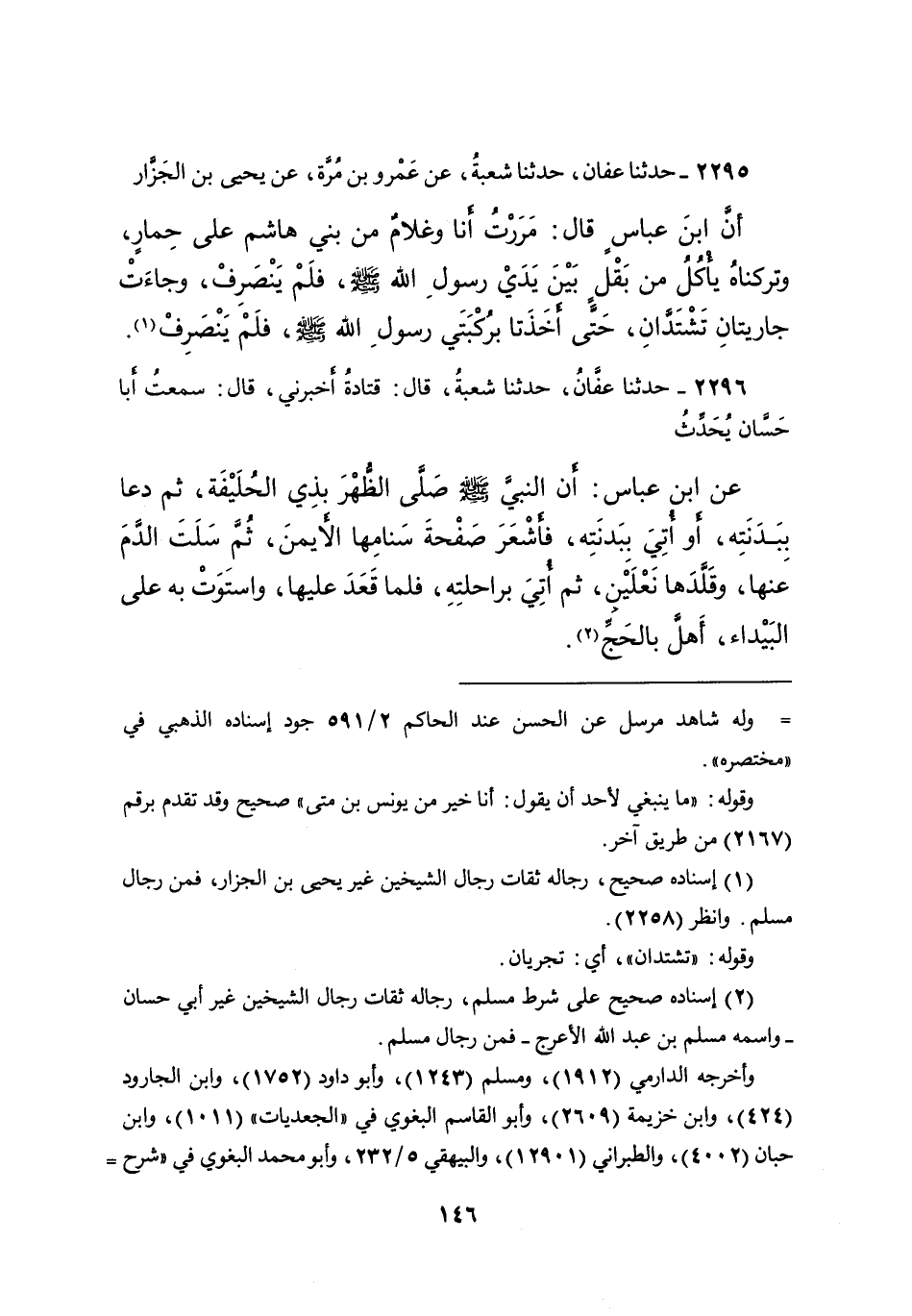 ٢٢٩٦ - حَدَّثَنَا عَفَّانُ، حَدَّثَنَا شُعْبَةُ، قَالَ: قَتَادَةُ، أَخْبَرَنِي قَالَ: سَمِعْتُ أَبَا حَسَّانَ، يُحَدِّثُ عَنِ ابْنِ عَبَّاسٍ: " أَنَّ النَّبِيَّ صَلَّى اللهُ عَلَيْهِ وَسَلَّمَ صَلَّى الظُّهْرَ بِذِي الْحُلَيْفَةِ، ثُمَّ دَعَا بِبَدَنَتِهِ، أَوْ أُتِيَ بِبَدَنَتِهِ، فَأَشْعَرَ صَفْحَةَ سَنَامِهَا الْأَيْمَنِ، ثُمَّ سَلَتَ الدَّمَ عَنْهَا، وَقَلَّدَهَا نَعْلَيْنِ، ثُمَّ أَتَى بِرَاحِلَتِهِ، فَلَمَّا قَعَدَ عَلَيْهَا، وَاسْتَوَتْ بِهِ عَلَى الْبَيْدَاءِ، أَهَلَّ بِالْحَجِّ " (٢)