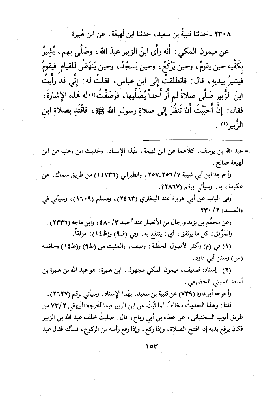 ٢٣٠٨ - حَدَّثَنَا قُتَيْبَةُ بْنُ سَعِيدٍ، حَدَّثَنَا ابْنُ لَهِيعَةَ، عَنِ ابْنِ هُبَيْرَةَ، عَنْ مَيْمُونٍ الْمَكِّيِّ: أَنَّهُ رَأَى ابْنَ الزُّبَيْرِ عَبْدَ اللهِ، وَصَلَّى بِهِمْ، " يُشِيرُ بِكَفَّيْهِ حِينَ يَقُومُ، وَحِينَ يَرْكَعُ، وَحِينَ يَسْجُدُ، وَحِينَ يَنْهَضُ لِلقِيَامِ، فَيَقُومُ فَيُشِيرُ بِيَدَيْهِ "، قَالَ: فَانْطَلَقْتُ إِلَى ابْنِ عَبَّاسٍ فَقُلْتُ لَهُ: إِنِّي قَدْ رَأَيْتُ ابْنَ الزُّبَيْرِ صَلَّى صَلاةً لَمْ أَرَ أَحَدًا يُصَلِّيهَا، فَوَصَفْتُ (١) لَهُ هَذِهِ الْإِشَارَةَ، فَقَالَ: " إِنْ أَحْبَبْتَ أَنْ تَنْظُرَ إِلَى صَلَاةِ رَسُولِ اللهِ صَلَّى اللهُ عَلَيْهِ وَسَلَّمَ، فَاقْتَدِ بِصَلَاةِ ابْنِ الزُّبَيْرِ " (٢)
