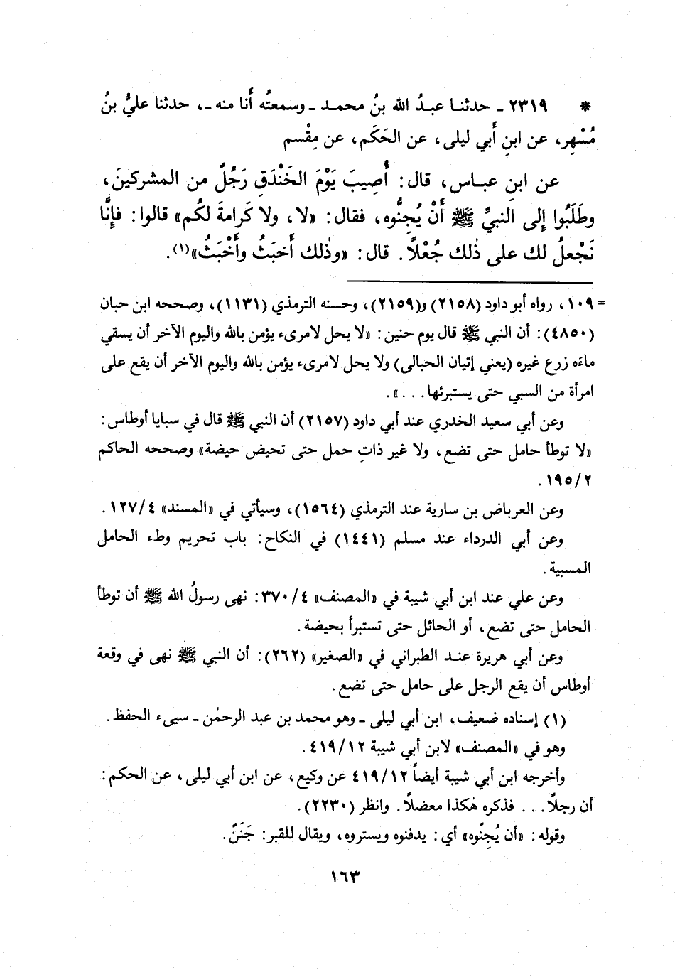 = ١٠٩، رواه أبو داود (٢١٥٨) و (٢١٥٩) ، وحسنه الترمذي (١١٣١) ، وصححه ابن حبان (٤٨٥٠) : أن النبي صَلَّى اللهُ عَلَيْهِ وَسَلَّمَ قال يوم حنين: "لا يحل لامرىء يؤمن بالله واليوم الآخر أن يسقي ماءَه زرع غيره (يعني إتيان الحبالى) ولا يحل لامرىء يؤمن بالله واليوم الآخر أن يقع على امرأة من السبي حتى يستبرئها ... ".