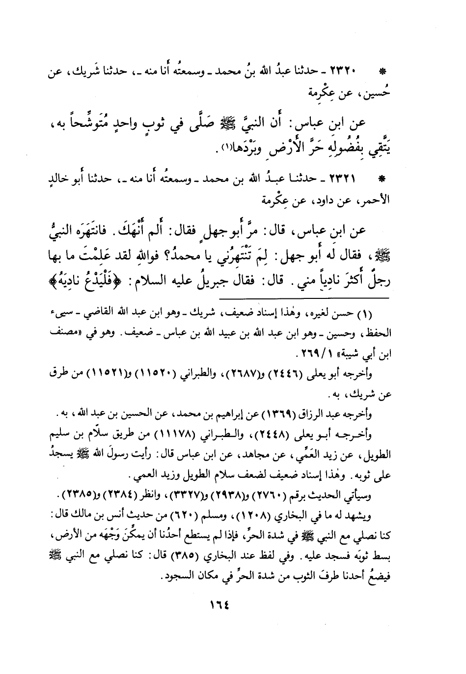 * ٢٣٢١ - حَدَّثَنَا عَبْدُ اللهِ بْنُ مُحَمَّدٍ، وَسَمِعْتُهُ أَنَا مِنْهُ، حَدَّثَنَا أَبُو خَالِدٍ الْأَحْمَرُ، عَنْ دَاوُدَ، عَنْ عِكْرِمَةَ، عَنِ ابْنِ عَبَّاسٍ، قَالَ: " مَرَّ أَبُو جَهْلٍ فَقَالَ: أَلَمْ أَنْهَكَ، فَانْتَهَرَهُ النَّبِيُّ صَلَّى اللهُ عَلَيْهِ وَسَلَّمَ، فَقَالَ لَهُ أَبُو جَهْلٍ: لِمَ تَنْتَهِرُنِي يَا مُحَمَّدُ؟ فَوَاللهِ لَقَدْ عَلِمْتَ مَا بِهَا رَجُلٌ أَكْثَرُ نَادِيًا مِنِّي، قَالَ: فَقَالَ جِبْرِيلُ عَلَيْهِ السَّلَامُ: {فَلْيَدْعُ نَادِيَهُ}