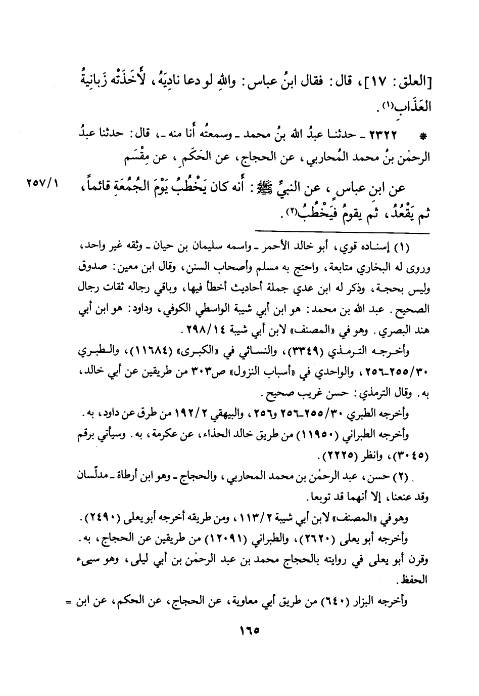 (٢) حسن، عبد الرحمن بن محمد المحاربي، والحجاج -وهو ابن أرطاة- مدلسان وقد عنعنا، إلا أنهما قد توبعا.