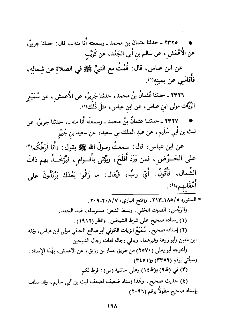 * ٢٣٢٧ - حَدَّثَنَا عُثْمَانُ بْنُ مُحَمَّدٍ، وَسَمِعْتُهُ أَنَا مِنْهُ، حَدَّثَنَا جَرِيرٌ، عَنْ لَيْثِ بْنِ أَبِي سُلَيْمٍ، عَنْ عَبْدِ الْمَلِكِ بْنِ سَعِيدٍ، عَنْ سَعِيدِ بْنِ جُبَيْرٍ، عَنِ ابْنِ عَبَّاسٍ قَالَ: سَمِعْتُ رَسُولَ اللهِ صَلَّى اللهُ عَلَيْهِ وَسَلَّمَ يَقُولُ: " أَنَا فَرَطُكُمْ (٣) عَلَى الْحَوْضِ، فَمَنْ وَرَدَ أَفْلَحَ، وَيُؤْتَى بِأَقْوَامٍ، فَيُؤْخَذُ بِهِمْ ذَاتَ الشِّمَالِ، فَأَقُولُ: أَيْ رَبِّ، فَيُقَالُ: مَا زَالُوا بَعْدَكَ يَرْتَدُّونَ عَلَى أَعْقَابِهِمْ " (٤)