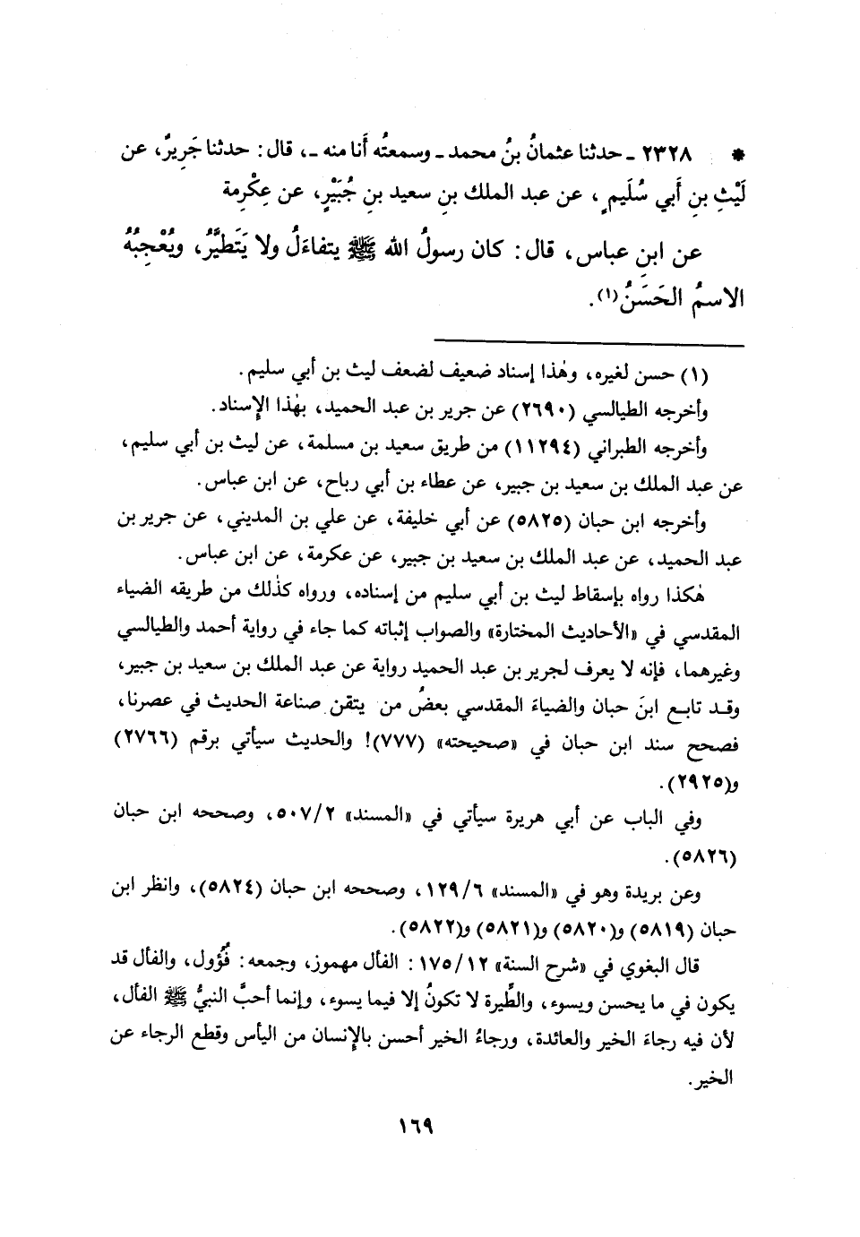 * ٢٣٢٨ - حَدَّثَنَا عُثْمَانُ بْنُ مُحَمَّدٍ، وَسَمِعْتُهُ أَنَا مِنْهُ، قَالَ: حَدَّثَنَا جَرِيرٌ، عَنْ لَيْثِ بْنِ أَبِي سُلَيْمٍ، عَنْ عَبْدِ الْمَلِكِ بْنِ سَعِيدِ بْنِ جُبَيْرٍ، عَنْ عِكْرِمَةَ، عَنِ ابْنِ عَبَّاسٍ قَالَ: " كَانَ رَسُولُ اللهِ صَلَّى اللهُ عَلَيْهِ وَسَلَّمَ، يَتَفَاءَلُ وَلا يَتَطَيَّرُ، وَيُعْجِبُهُ الاسْمُ الْحَسَنُ " (١)