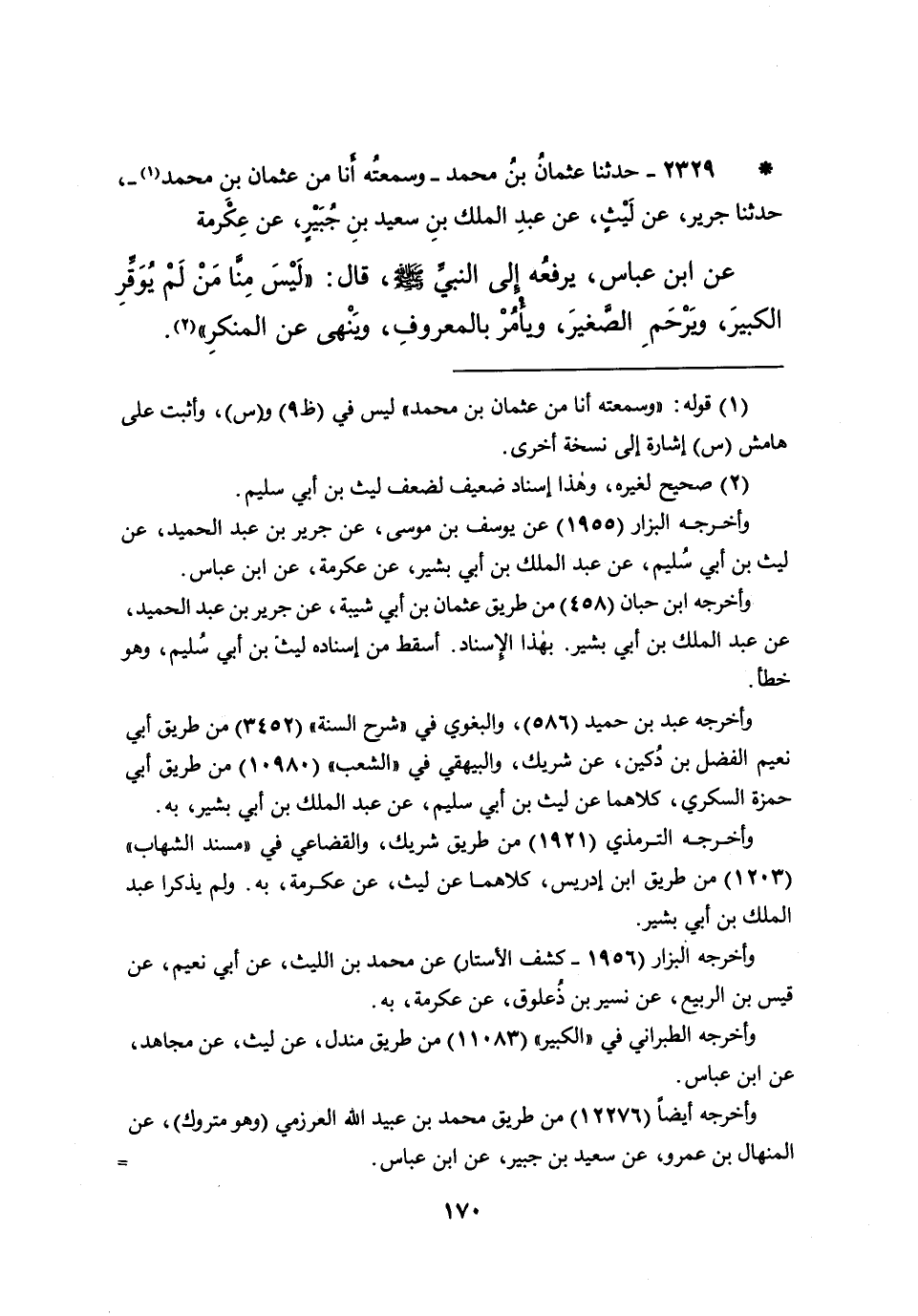 * ٢٣٢٩ - حَدَّثَنَا عُثْمَانُ بْنُ مُحَمَّدٍ، (١) وَسَمِعْتُهُ أَنَا مِنْ عُثْمَانَ بْنِ مُحَمَّدٍ، حَدَّثَنَا جَرِيرٌ، عَنْ لَيْثٍ، عَنْ عَبْدِ الْمَلِكِ بْنِ سَعِيدِ بْنِ جُبَيْرٍ، عَنْ عِكْرِمَةَ، عَنِ ابْنِ عَبَّاسٍ، يَرْفَعُهُ إِلَى النَّبِيِّ صَلَّى اللهُ عَلَيْهِ وَسَلَّمَ قَالَ: " لَيْسَ مِنَّا مَنْ لَمْ يُوَقِّرِ الْكَبِيرَ، وَيَرْحَمِ الصَّغِيرَ وَيَأْمُرْ بِالْمَعْرُوفِ، وَيَنْهَى عَنِ الْمُنْكَرِ " (٢)