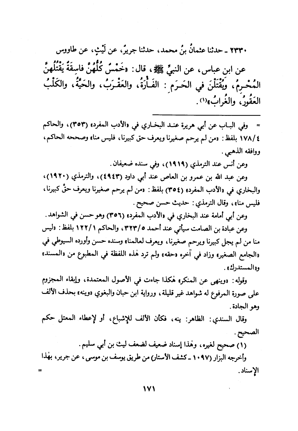 ٢٣٣٠ - حَدَّثَنَا عُثْمَانُ بْنُ مُحَمَّدٍ، حَدَّثَنَا جَرِيرٌ، عَنْ لَيْثٍ، عَنْ طَاوُسٍ، عَنِ ابْنِ عَبَّاسٍ، عَنِدَ النَّبِيِّ صَلَّى اللهُ عَلَيْهِ وَسَلَّمَ قَالَ: " خَمْسٌ كُلُّهُنَّ فَاسِقَةٌ يَقْتُلُهُنَّ الْمُحْرِمُ، وَيُقْتَلْنَ فِي الْحَرَمِ: الْفَأْرَةُ، وَالْعَقْرَبُ، وَالْحَيَّةُ، وَالْكَلْبُ الْعَقُورُ، وَالْغُرَابُ " (١)