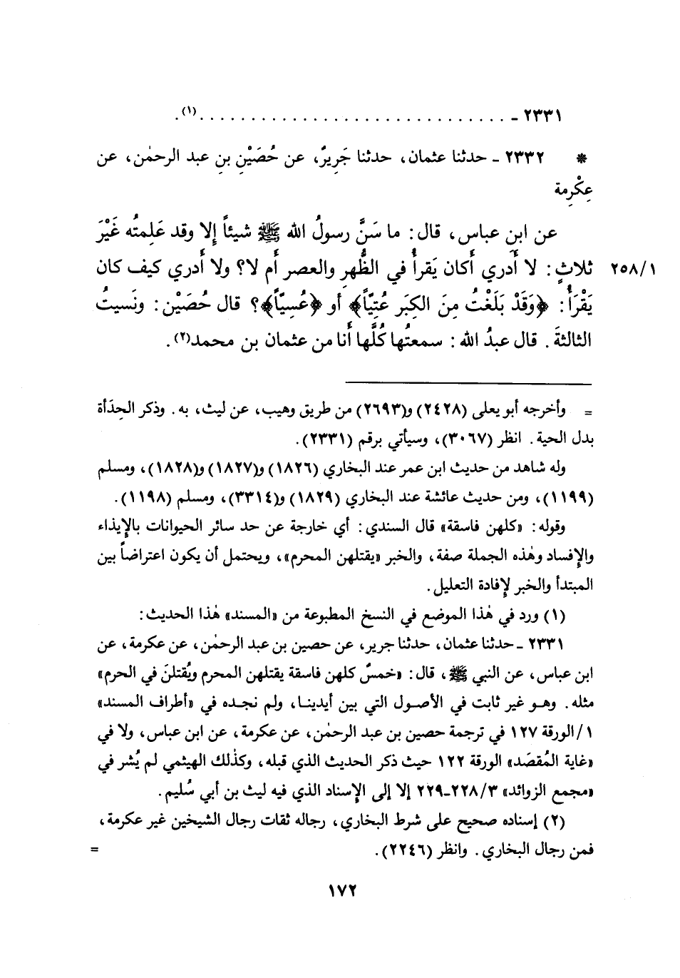 * ٢٣٣٢ - حَدَّثَنَا عُثْمَانُ، حَدَّثَنَا جَرِيرٌ، عَنْ حُصَيْنِ بْنِ عَبْدِ الرَّحْمَنِ، عَنْ عِكْرِمَةَ، عَنِ ابْنِ عَبَّاسٍ، قَالَ: " مَا سَنَّ رَسُولُ اللهِ صَلَّى اللهُ عَلَيْهِ وَسَلَّمَ، شَيْئًا إِلا وَقَدْ عَلِمْتُهُ غَيْرَ ثَلاثٍ: لَا أَدْرِي أَكَانَ يَقْرَأُ فِي الظُّهْرِ وَالْعَصْرِ أَمْ لَا؟ وَلا أَدْرِي كَيْفَ كَانَ يَقْرَأُ: (وَقَدْ بَلَغْتُ مِنَ الكِبَرِ عُتِيًّا) أَوْ " عُسُيًّا "؟، قَالَ حُصَيْنٌ: " وَنَسِيتُ الثَّالِثَةَ " قَالَ عَبْدُ اللهِ: " سَمِعْتُهَا كُلَّهَا أَنَا مِنْ عُثْمَانَ بْنِ مُحَمَّدٍ (٢)