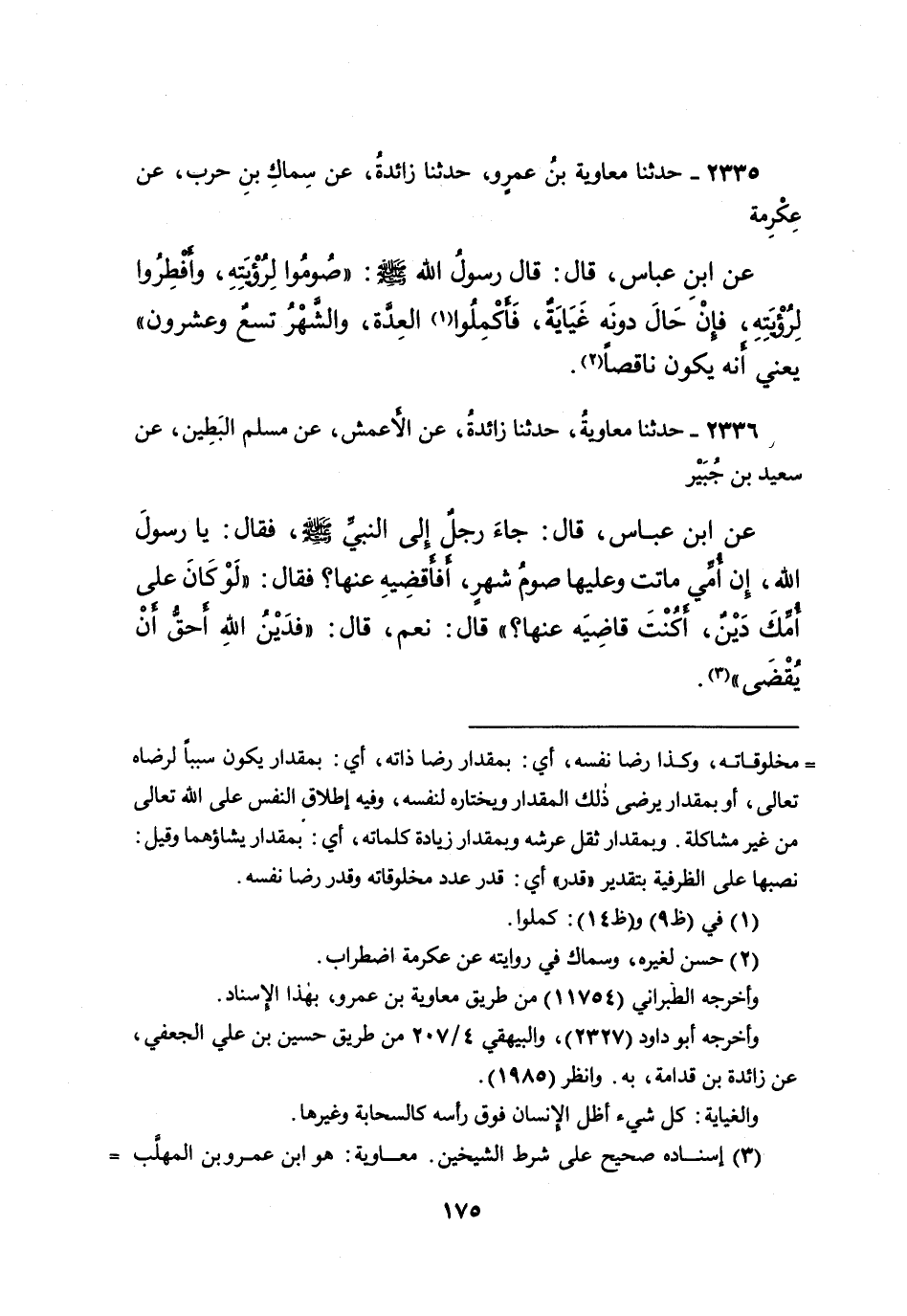 ٢٣٣٥ - حَدَّثَنَا مُعَاوِيَةُ بْنُ عَمْرٍو، حَدَّثَنَا زَائِدَةُ، عَنْ سِمَاكِ بْنِ حَرْبٍ، عَنْ عِكْرِمَةَ، عَنِ ابْنِ عَبَّاسٍ، قَالَ: قَالَ رَسُولُ اللهِ صَلَّى اللهُ عَلَيْهِ وَسَلَّمَ: " صُومُوا لِرُؤْيَتِهِ، وَأَفْطِرُوا لِرُؤْيَتِهِ، فَإِنْ حَالَ دُونَهُ غَيَايَةٌ، فَأَكْمِلُوا (١) الْعِدَّةَ، وَالشَّهْرُ تِسْعٌ وَعِشْرُونَ، - يَعْنِي أَنَّهُ نَاقِصٌ - " (٢)