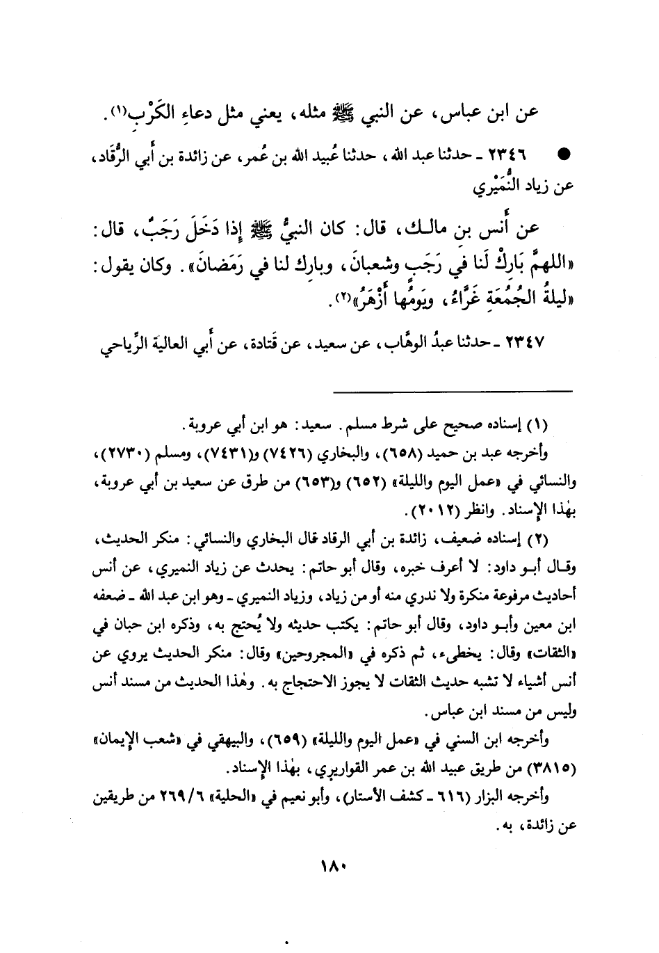 • ٢٣٤٦ - حَدَّثَنَا عَبْدُ اللهِ، حَدَّثَنَا عُبَيْدُ اللهِ بْنُ عُمَرَ، عَنْ زَائِدَةَ بْنِ أَبِي الرُّقَادِ، عَنْ زِيَادٍ النُّمَيْرِيِّ، عَنْ أَنَسِ بْنِ مَالِكٍ، قَالَ: كَانَ النَّبِيُّ صَلَّى اللهُ عَلَيْهِ وَسَلَّمَ إِذَا دَخَلَ رَجَبٌ، قَالَ: " اللهُمَّ بَارِكْ لَنَا فِي رَجَبٍ وَشَعْبَانَ، وَبَارِكْ لَنَا فِي رَمَضَانَ " وَكَانَ يَقُولُ: " لَيْلَةُ الْجُمُعَةِ غَرَّاءُ، وَيَوْمُهَا أَزْهَرُ " (٢)