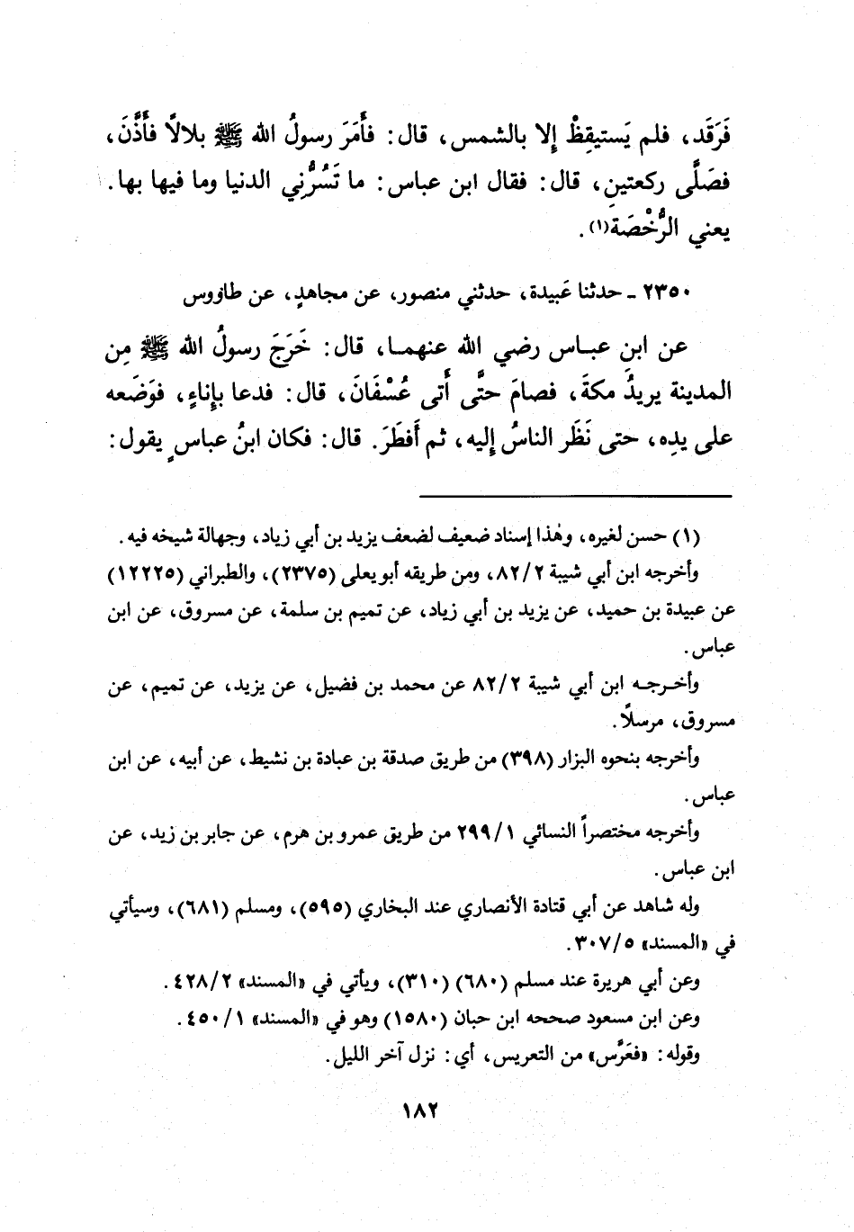فَرَقَدَ، فَلَمْ يَسْتَيْقِظْ إِلَّا بِالشَّمْسِ "، قَالَ: " فَأَمَرَ رَسُولُ اللهِ صَلَّى اللهُ عَلَيْهِ وَسَلَّمَ بِلالًا فَأَذَّنَ، فَصَلَّى رَكْعَتَيْنِ " قَالَ: فَقَالَ ابْنُ عَبَّاسٍ: " مَا تَسُرُّنِي الدُّنْيَا وَمَا فِيهَا بِهَا - يَعْنِي الرُّخْصَةَ - " (١)