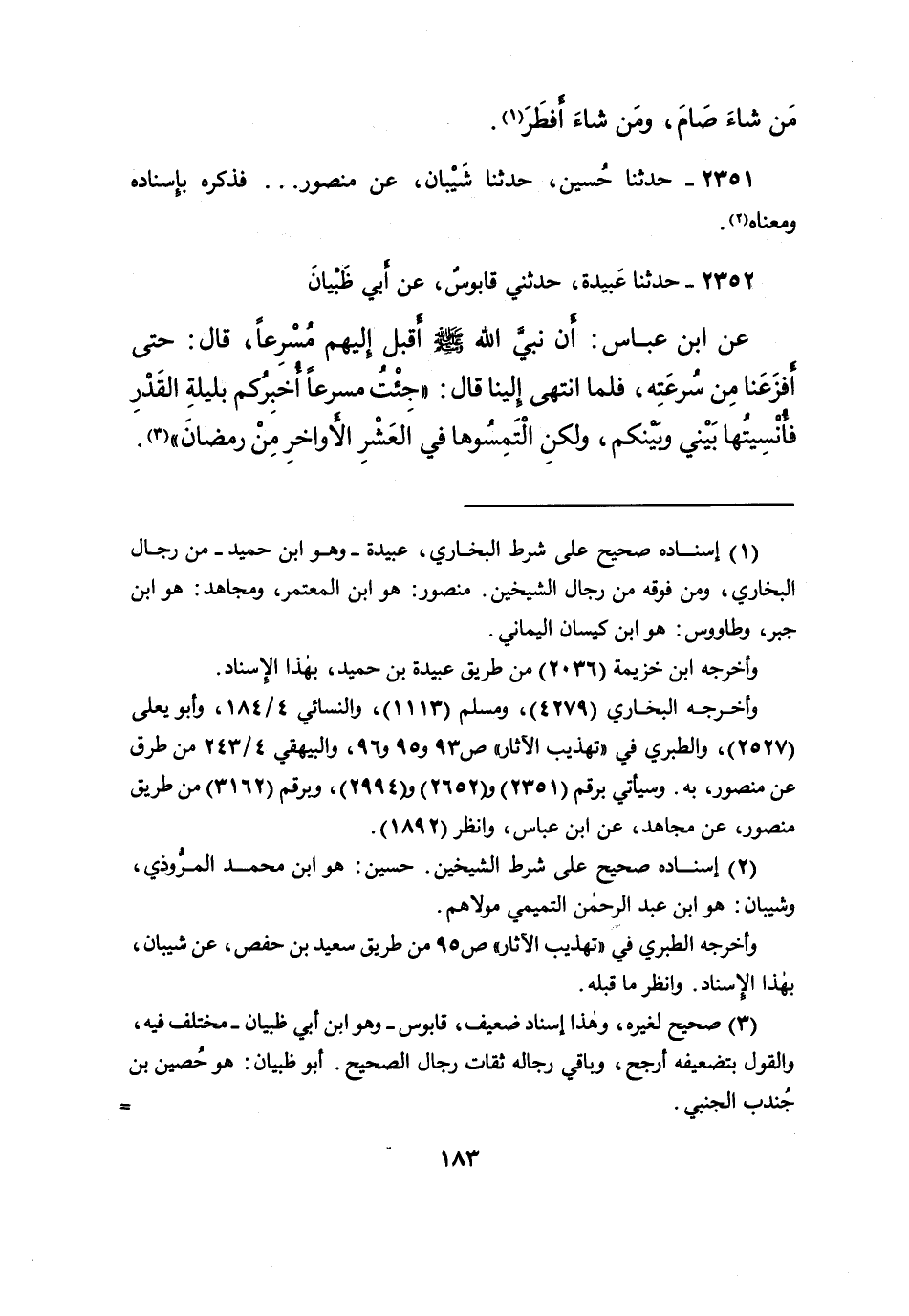 ٢٣٥٢ - حَدَّثَنَا عَبِيدَةُ، حَدَّثَنِي قَابُوسُ، عَنْ أَبِي ظَبْيَانَ، عَنِ ابْنِ عَبَّاسٍ: أَنَّ نَبِيَّ اللهِ صَلَّى اللهُ عَلَيْهِ وَسَلَّمَ أَقْبَلَ إِلَيْهِمْ مُسْرِعًا، قَالَ: حَتَّى أَفْزَعَنَا مِنْ سُرْعَتِهِ، فَلَمَّا انْتَهَى إِلَيْنَا قَالَ: " جِئْتُ مُسْرِعًا أُخْبِرُكُمْ بِلَيْلَةِ الْقَدْرِ فَأُنْسِيتُهَا بَيْنِي وَبَيْنَكُمْ، وَلَكِنِ الْتَمِسُوهَا فِي الْعَشْرِ الْأَوَاخِرِ مِنْ رَمَضَانَ " (٣)