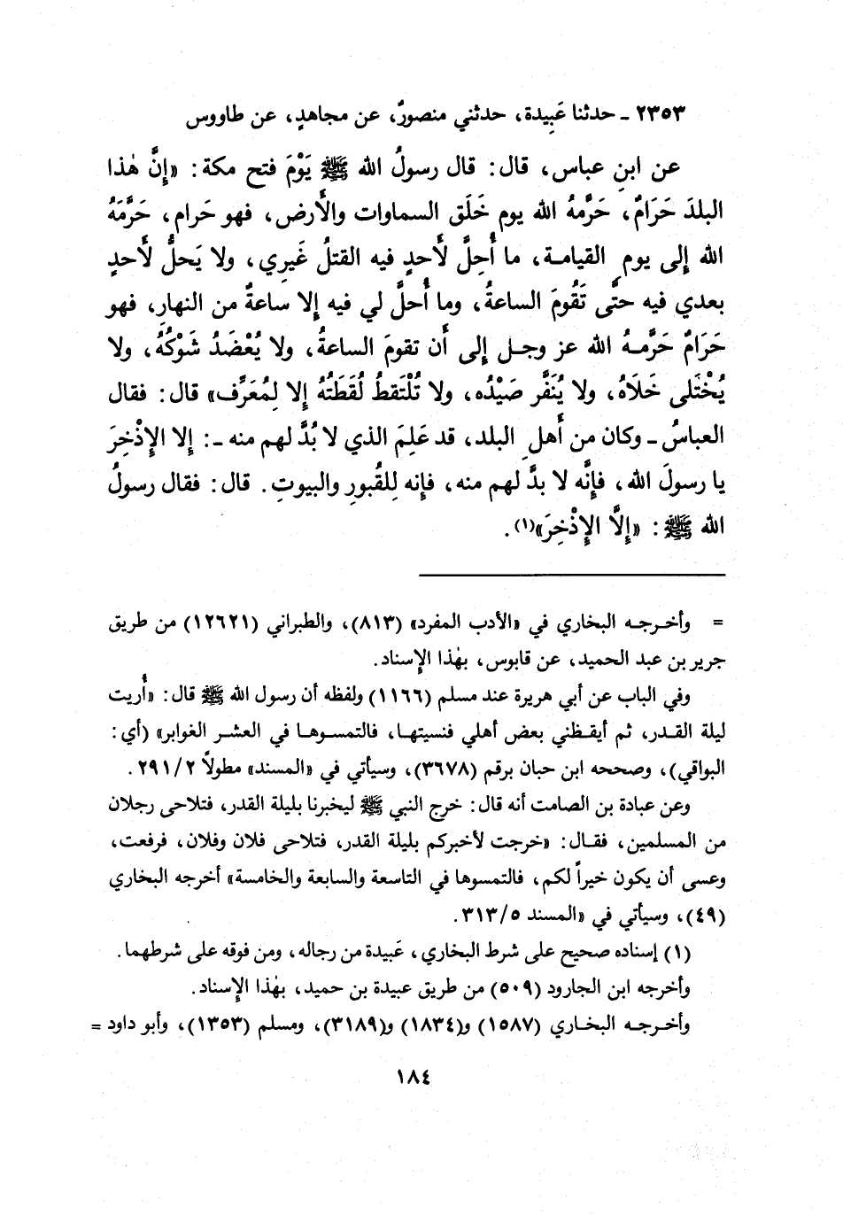 ٢٣٥٣ - حَدَّثَنَا عَبِيدَةُ، حَدَّثَنِي مَنْصُورٌ، عَنْ مُجَاهِدٍ، عَنْ طَاوُسٍ، عَنِ ابْنِ عَبَّاسٍ، قَالَ: قَالَ رَسُولُ اللهِ صَلَّى اللهُ عَلَيْهِ وَسَلَّمَ، يَوْمَ فَتْحِ مَكَّةَ: " إِنَّ هَذَا الْبَلَدَ حَرَامٌ، حَرَّمَهُ اللهُ يَوْمَ خَلَقَ السَّمَاوَاتِ وَالْأَرْضَ، فَهُوَ حَرَامٌ، حَرَّمَهُ اللهُ إِلَى يَوْمِ الْقِيَامَةِ، مَا أُحِلَّ لِأَحَدٍ فِيهِ الْقَتْلُ غَيْرِي، وَلا يَحِلُّ لِأَحَدٍ بَعْدِي فِيهِ حَتَّى تَقُومَ السَّاعَةُ، وَمَا أُحِلَّ لِي فِيهِ إِلا سَاعَةٌ مِنَ النَّهَارِ، فَهُوَ حَرَامٌ حَرَّمَهُ اللهُ عَزَّ وَجَلَّ إِلَى أَنْ تَقُومَ السَّاعَةُ، وَلا يُعْضَدُ شَوْكُهُ، وَلا يُخْتَلَى خَلاهُ، وَلا يُنَفَّرُ صَيْدُهُ، وَلا تُلْتَقَطُ لُقَطَتُهُ إِلا لِمُعَرِّفٍ "، قَالَ: فَقَالَ الْعَبَّاسُ: - وَكَانَ مِنْ أَهْلِ الْبَلَدِ، قَدْ عَلِمَ الَّذِي لَا بُدَّ لَهُمْ مِنْهُ - إِلا الْإِذْخِرَ يَا رَسُولَ اللهِ، فَإِنَّهُ لَا بُدَّ لَهُمْ مِنْهُ، فَإِنَّهُ لِلقُبُورِ وَالْبُيُوتِ، قَالَ: فَقَالَ رَسُولُ اللهِ صَلَّى اللهُ عَلَيْهِ وَسَلَّمَ: " إِلا الْإِذْخِرَ " (١)