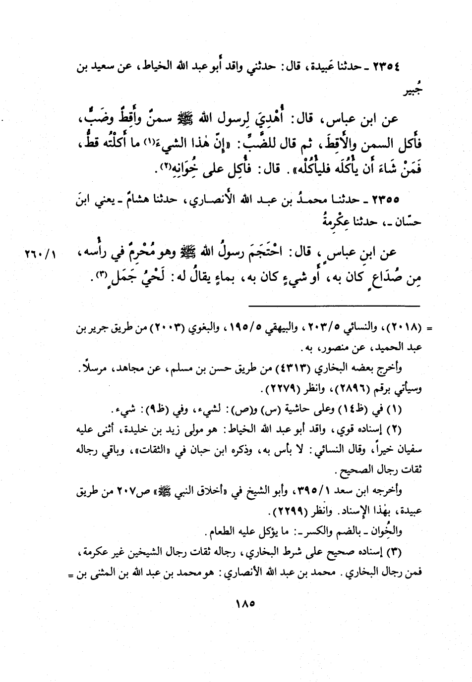 ٢٣٥٤ - حَدَّثَنَا عَبِيدَةُ، قَالَ: حَدَّثَنِي وَاقِدٌ أَبُو عَبْدِ اللهِ الْخَيَّاطُ، عَنْ سَعِيدِ بْنِ جُبَيْرٍ، عَنِ ابْنِ عَبَّاسٍ، قَالَ: أُهْدِيَ لِرَسُولِ اللهِ صَلَّى اللهُ عَلَيْهِ وَسَلَّمَ، سَمْنٌ وَأَقِطٌ وَضَبٌّ، فَأَكَلَ السَّمْنَ وَالْأَقِطَ، ثُمَّ قَالَ لِلضَّبِّ: " إِنَّ هَذَا الشَّيْءَ (١) مَا أَكَلْتُهُ قَطُّ، فَمَنْ شَاءَ أَنْ يَأْكُلَهُ فَلْيَأْكُلْهُ " قَالَ: فَأُكِل عَلَى خِوَانِهِ (٢)