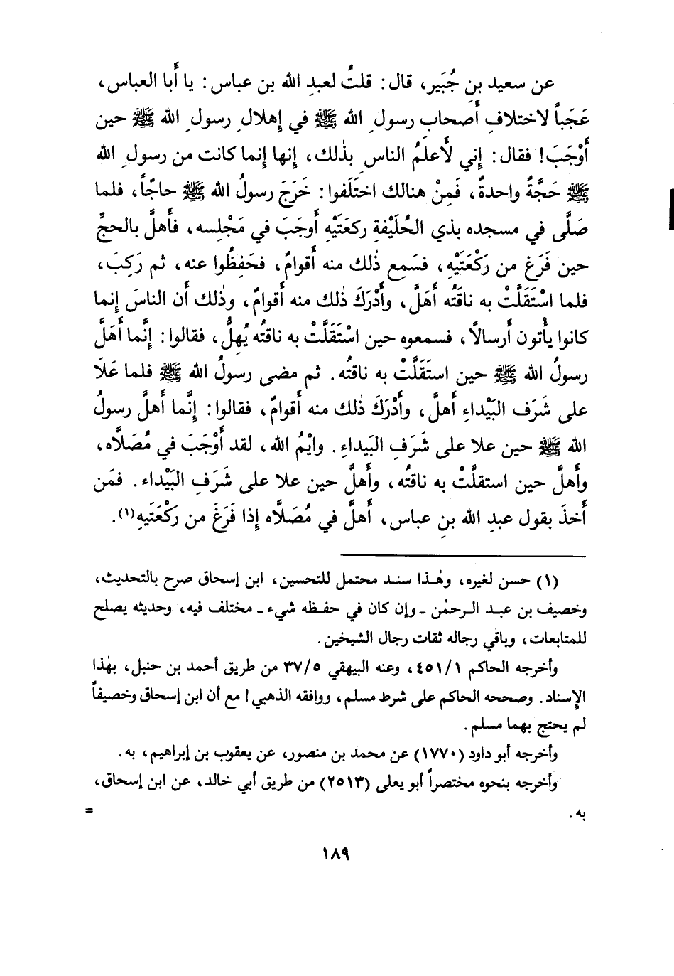 عَنْ سَعِيدِ بْنِ جُبَيْرٍ، قَالَ: قُلْتُ لِعَبْدِ اللهِ بْنِ عَبَّاسٍ: يَا أَبَا الْعَبَّاسِ، عَجَبًا لِاخْتِلافِ أَصْحَابِ رَسُولِ اللهِ صَلَّى اللهُ عَلَيْهِ وَسَلَّمَ، فِي إِهْلالِ رَسُولِ اللهِ صَلَّى اللهُ عَلَيْهِ وَسَلَّمَ، حِينَ أَوْجَبَ فَقَالَ: إِنِّي لَأَعْلَمُ النَّاسِ بِذَلِكَ، إِنَّهَا إِنَّمَا كَانَتْ مِنْ رَسُولِ اللهِ صَلَّى اللهُ عَلَيْهِ وَسَلَّمَ، حَجَّةً وَاحِدَةً، فَمِنْ هُنَالِكَ اخْتَلَفُوا: " خَرَجَ رَسُولُ اللهِ صَلَّى اللهُ عَلَيْهِ وَسَلَّمَ حَاجًّا، فَلَمَّا صَلَّى فِي مَسْجِدِهِ بِذِي الْحُلَيْفَةِ رَكْعَتَيْهِ أَوْجَبَ فِي مَجْلِسِهِ، فَأَهَلَّ بِالْحَجِّ حِينَ فَرَغَ مِنْ رَكْعَتَيْهِ، فَسَمِعَ ذَلِكَ مِنْهُ أَقْوَامٌ، فَحَفِظُوا عَنْهُ، ثُمَّ رَكِبَ، فَلَمَّا اسْتَقَلَّتْ بِهِ نَاقَتُهُ أَهَلَّ، وَأَدْرَكَ ذَلِكَ مِنْهُ أَقْوَامٌ، وَذَلِكَ أَنَّ النَّاسَ إِنَّمَا كَانُوا يَأْتُونَ أَرْسَالًا، فَسَمِعُوهُ حِينَ اسْتَقَلَّتْ بِهِ نَاقَتُهُ يُهِلُّ، فَقَالُوا: إِنَّمَا أَهَلَّ رَسُولُ اللهِ صَلَّى اللهُ عَلَيْهِ وَسَلَّمَ، حِينَ اسْتَقَلَّتْ بِهِ نَاقَتُهُ، ثُمَّ مَضَى رَسُولُ اللهِ صَلَّى اللهُ عَلَيْهِ وَسَلَّمَ فَلَمَّا عَلَا عَلَى شَرَفِ الْبَيْدَاءِ أَهَلَّ، وَأَدْرَكَ ذَلِكَ مِنْهُ أَقْوَامٌ، فَقَالُوا: إِنَّمَا أَهَلَّ رَسُولُ اللهِ صَلَّى اللهُ عَلَيْهِ وَسَلَّمَ، حِينَ عَلَا عَلَى شَرَفِ الْبَيْدَاءِ، وَايْمُ اللهِ، لَقَدْ أَوْجَبَ فِي مُصَلَّاهُ، وَأَهَلَّ حِينَ اسْتَقَلَّتْ بِهِ نَاقَتُهُ، وَأَهَلَّ حِينَ عَلَا عَلَى شَرَفِ الْبَيْدَاءِ، فَمَنْ أَخَذَ بِقَوْلِ عَبْدِ اللهِ بْنِ عَبَّاسٍ، أَهَلَّ فِي مُصَلَّاهُ إِذَا فَرَغَ مِنْ رَكْعَتَيْهِ " (١)