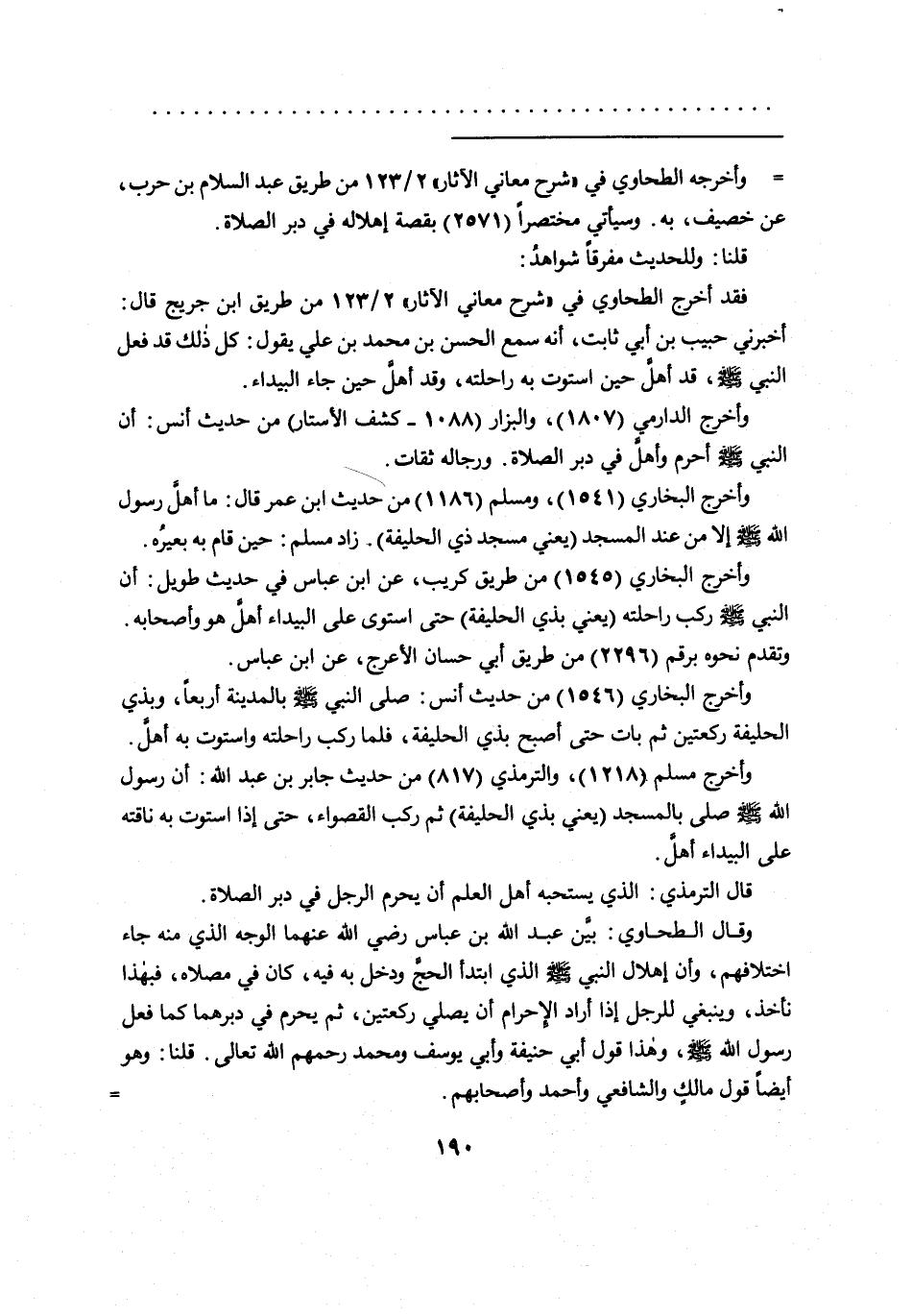 وقال الطحاوي: بين عبد الله بن عباس رضي الله عنهما الوجه الذي منه جاء اختلافهم، وأن إهلال النبي صَلَّى اللهُ عَلَيْهِ وَسَلَّمَ الذي ابتدأ الحج ودخل به فيه، كان في مصلاه، فبهذا نأخذ، وينبغي للرجل إذا أراد الإحرام أن يصلي ركعتين، ثم يحرم في دبرهما كما فعل رسول الله صَلَّى اللهُ عَلَيْهِ وَسَلَّمَ، وهذا قول أبي حنيفة وأبي يوسف ومحمد رحمهم الله تعالى. قلنا: وهو أيضاً قول مالكٍ والشافعي وأحمد وأصحابهم. =