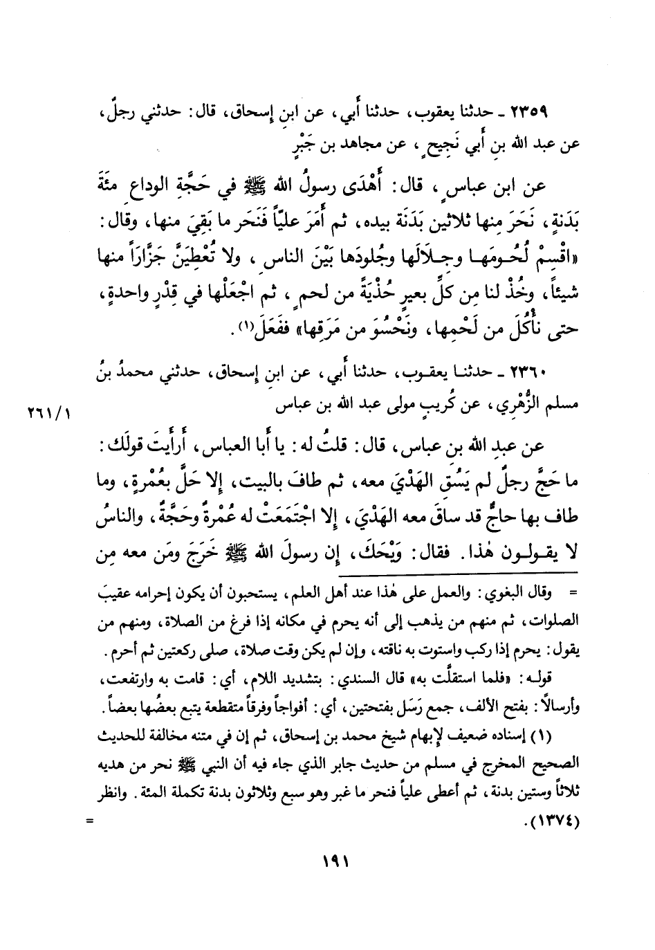 ٢٣٥٩ - حَدَّثَنَا يَعْقُوبُ، حَدَّثَنَا أَبِي، عَنِ ابْنِ إِسْحَاقَ، قَالَ: حَدَّثَنِي رَجُلٌ، عَنْ عَبْدِ اللهِ بْنِ أَبِي نَجِيحٍ، عَنْ مُجَاهِدِ بْنِ جَبْرٍ، عَنِ ابْنِ عَبَّاسٍ قَالَ: أَهْدَى رَسُولُ اللهِ صَلَّى اللهُ عَلَيْهِ وَسَلَّمَ، فِي حَجَّةِ الْوَدَاعِ مِائَةَ بَدَنَةٍ، نَحَرَ مِنْهَا ثَلاثِينَ بَدَنَةً بِيَدِهِ، ثُمَّ أَمَرَ عَلِيًّا فَنَحَرَ مَا بَقِيَ مِنْهَا، وَقَالَ: " اقْسِمْ لُحُومَهَا وَجِلالَهَا وَجُلُودَهَا بَيْنَ النَّاسِ، وَلا تُعْطِيَنَّ جَزَّارًا مِنْهَا شَيْئًا، وَخُذْ لَنَا مِنْ كُلِّ بَعِيرٍ حُذْيَةً مِنْ لَحْمٍ، ثُمَّ اجْعَلْهَا فِي قِدْرٍ وَاحِدَةٍ، حَتَّى نَأْكُلَ مِنْ لَحْمِهَا، وَنَحْسُوَ مِنْ مَرَقِهَا " فَفَعَلَ (١)